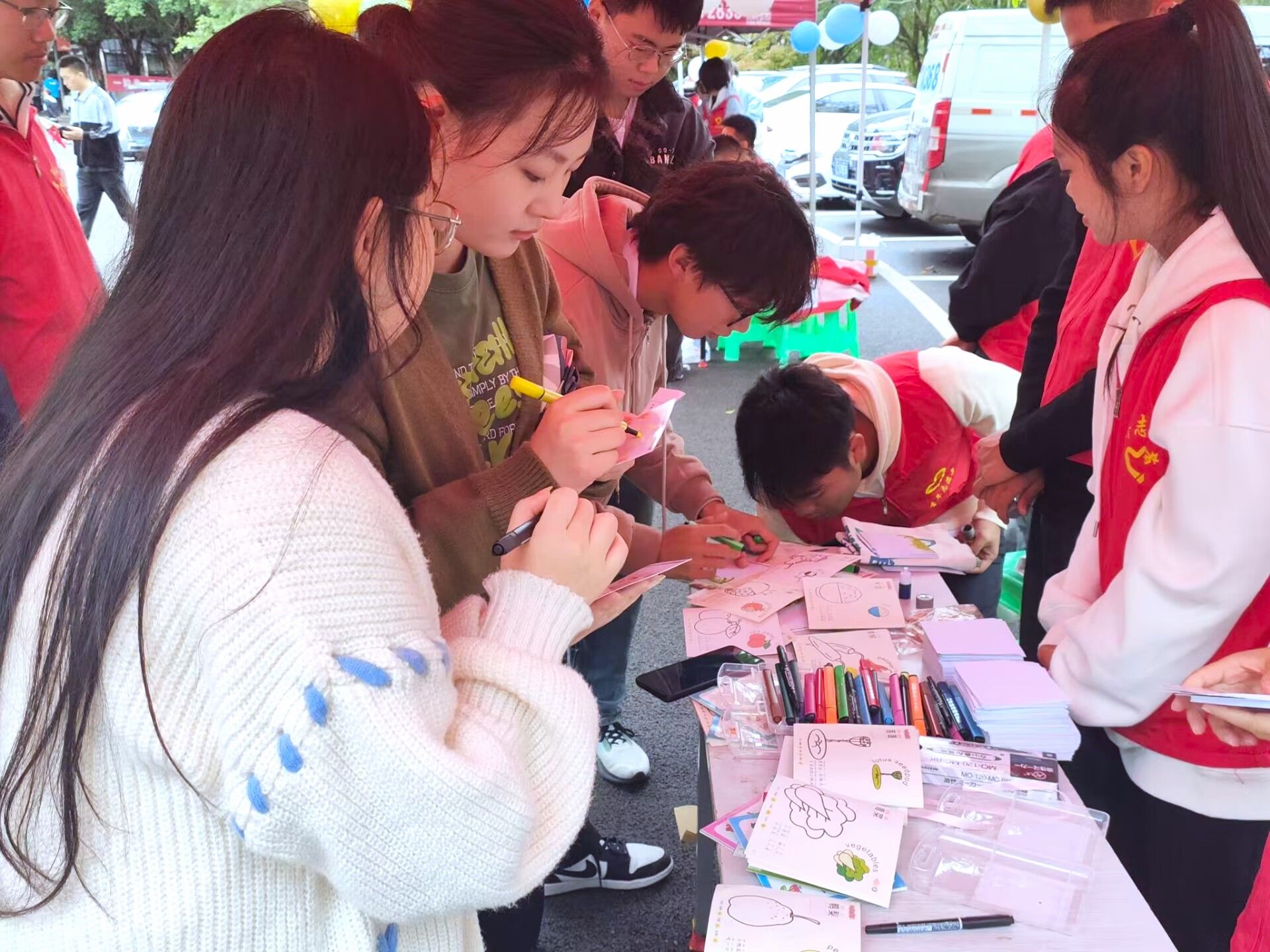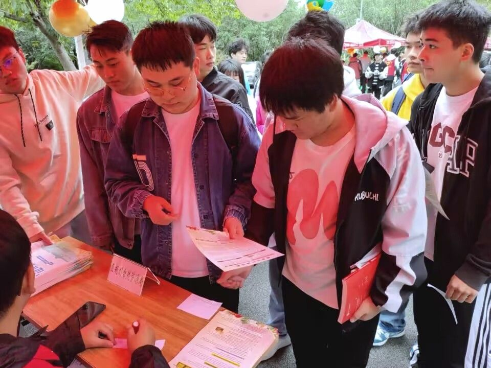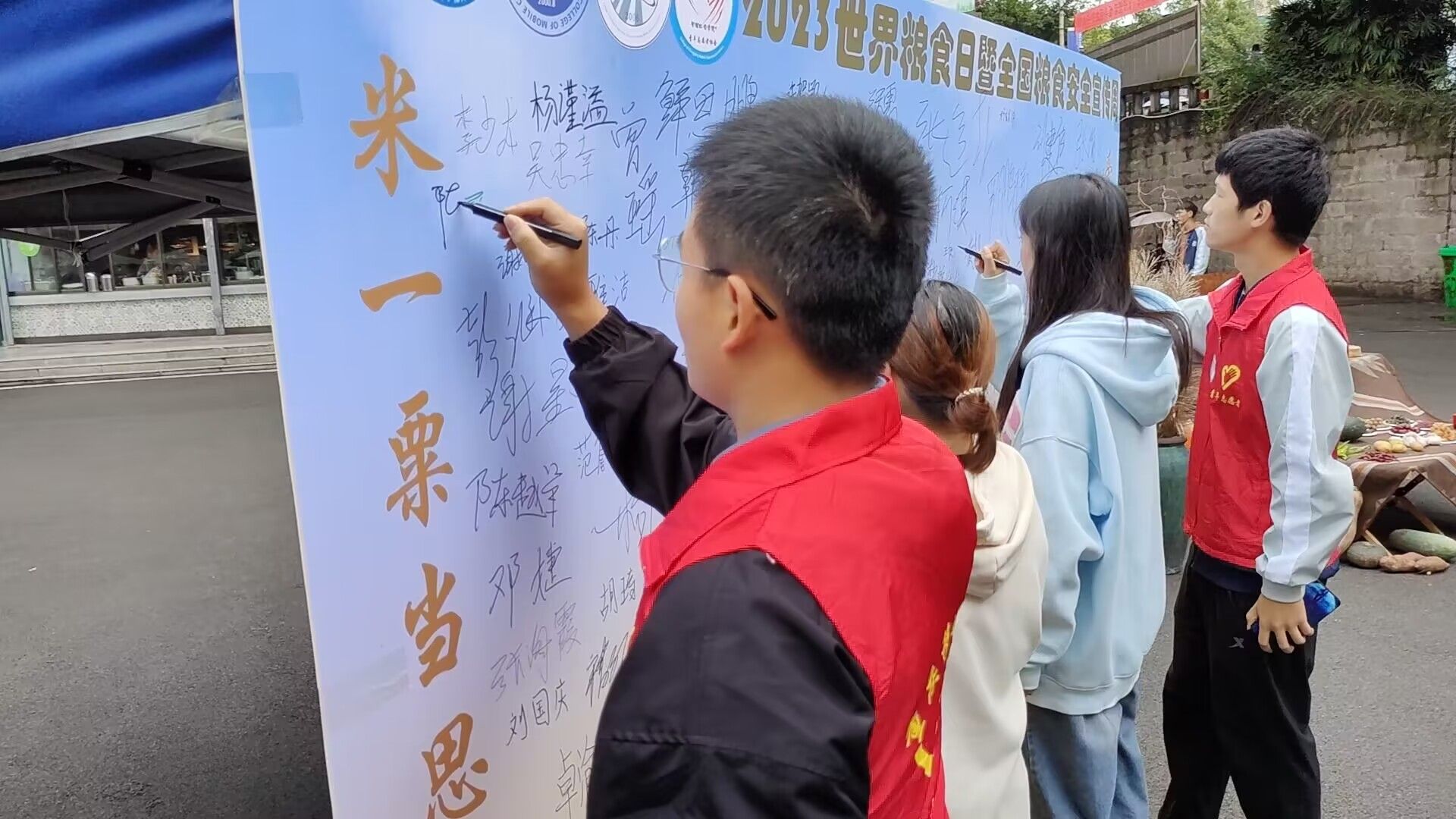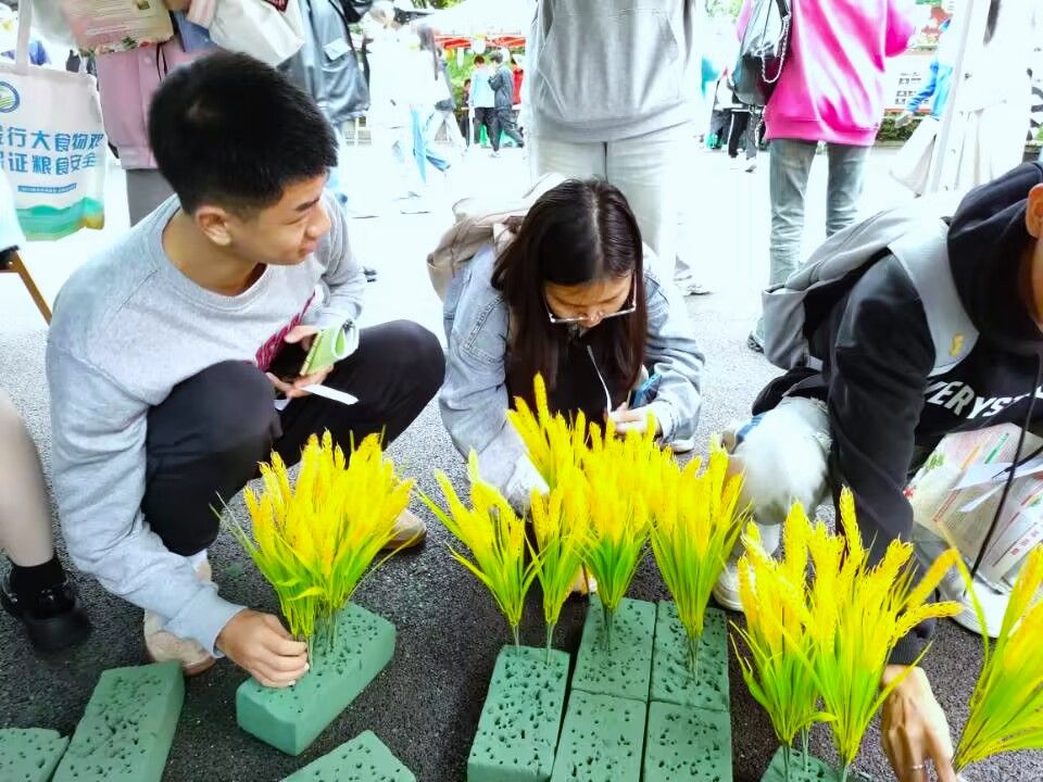室外场地分为拍照打卡区、知识宣传区以及游戏体验区。智能工程学院青年志愿者协会与别都书院合作共同搭建展示台,展示农耕基地相关物品,设置拍照打卡签名墙,同学们积极签名合影留念,此外同学们还可以到宣传区领取粮食安全宣传单和宣传册,加大粮食安全宣传力度