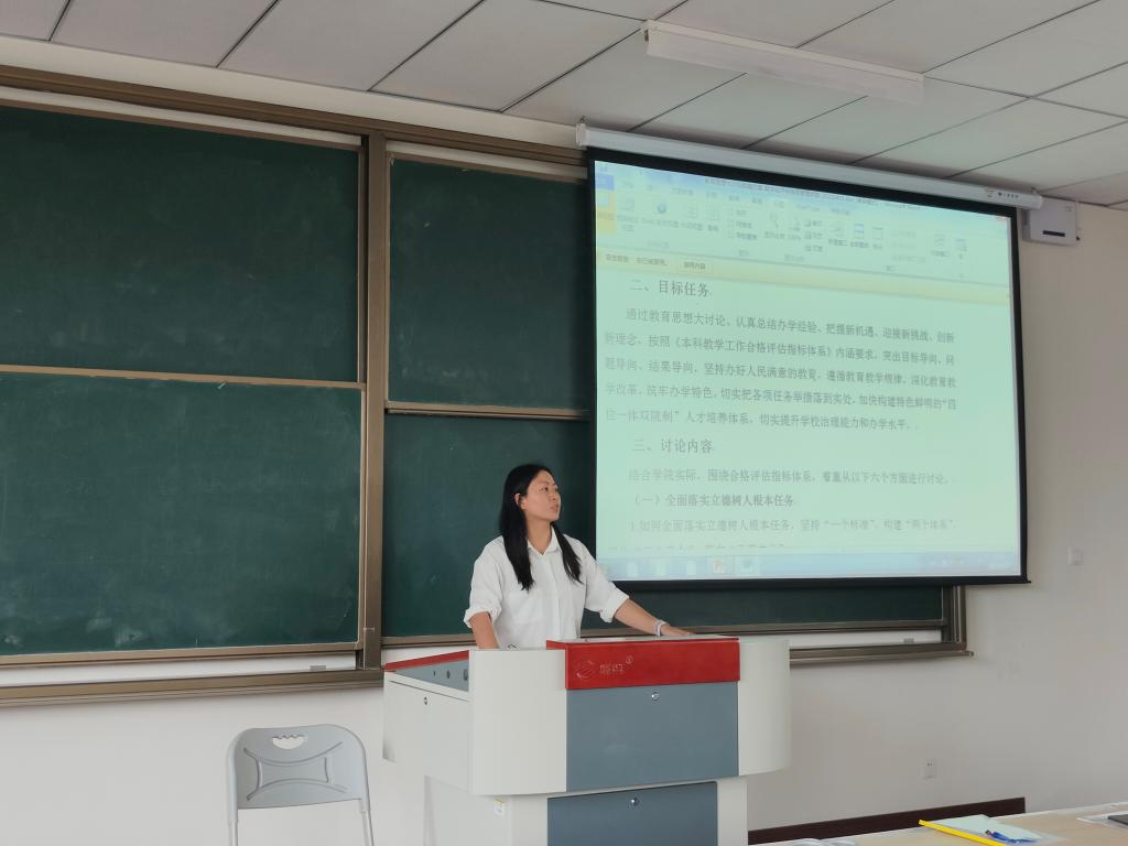 潘院长在会议开始提出了教育思想大讨论的目的和必要性,以合格评估为抓手,以教学质量提升为主线,以内涵建设为重点,强化学院教学特色,不断提高教学质量,汇聚智慧查找问题不足,逐渐形成具有特色的学院教育新理念、新举措、新路径。在接下来一个月的讨论中,老师们应围绕全面落实立德树人的根本任务,落实学校办学目标定位的目标,积极交流深化专业、课程改革的经验,致力于提升教师队伍师德师风建设,保障教学质量到位的方法。