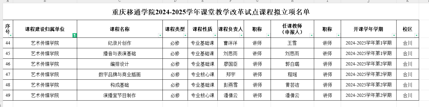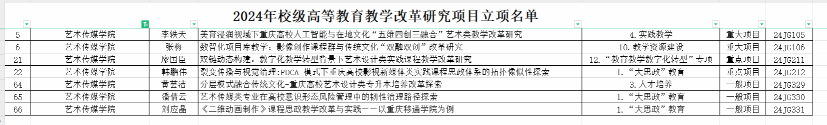 2024年校级秋季双师认定中,艺术传媒学院教师郑宇、廖国臣、雷菁菁、彭燕雪、胡婉、程瑶、曹洋洋、李创、李毓美被认定为校级双师型教师。