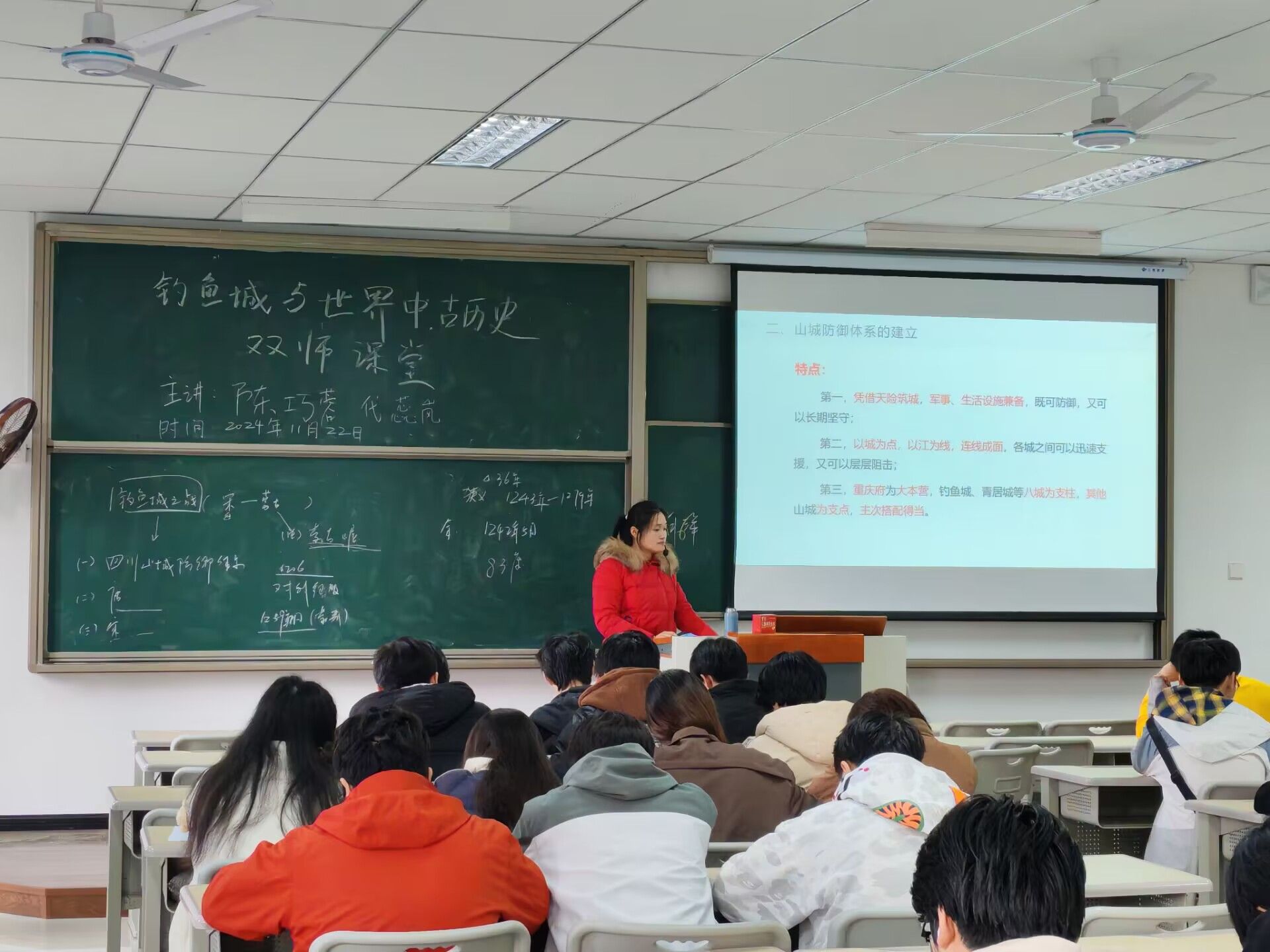 11月22日上午,地域文化与城市发展研究院《钓鱼城与世界中古历史》课程主讲老师陈巧蓉邀请实训中心代蕊岚老师于在第九教学楼307教室,共同开展了一场别开生面的双师课堂教学活动。通过生动有趣的互动教学,带领学生们通过诗词了解了宋代人的生活,培养学生的跨学科思维。