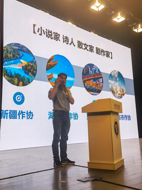 诗歌工坊导师、青年作家王基胜则以脱口秀的风格,以自己北漂时一面做洗发水测试员、婚庆工作人员和影子写手等工作、一面坚持写作的经历,幽默风趣地向大家讲述了他所理解的文学的用处。他亦庄亦谐的宣讲风格引来同学们阵阵大笑与掌声,当他走下台时,台下的呼喊声不断响起。