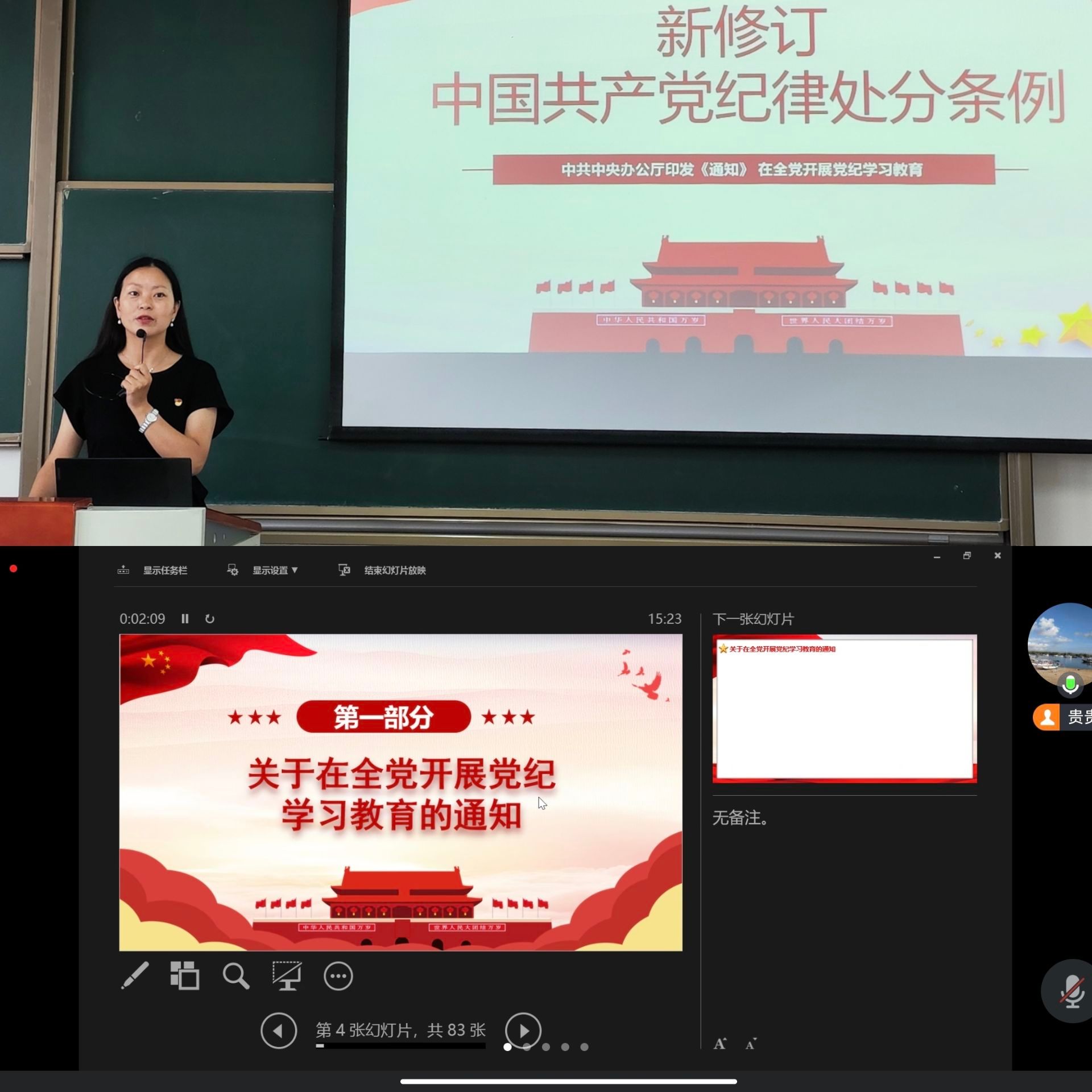 为深入学习贯彻习近平总书记关于加强党的纪律建设的重要论述以及关于党纪学习教育的重要讲话。数字经济与信息管理学院教师党支部于2024年6月26日下午15:00,线上与线下(双栀403)相结合的方式,召开了党员教师“学习新修订中国共产党纪律处分条例”专题学习会,支部书记刘贵容同志主持本次会议,学院教师党支部全体党员同志参会。