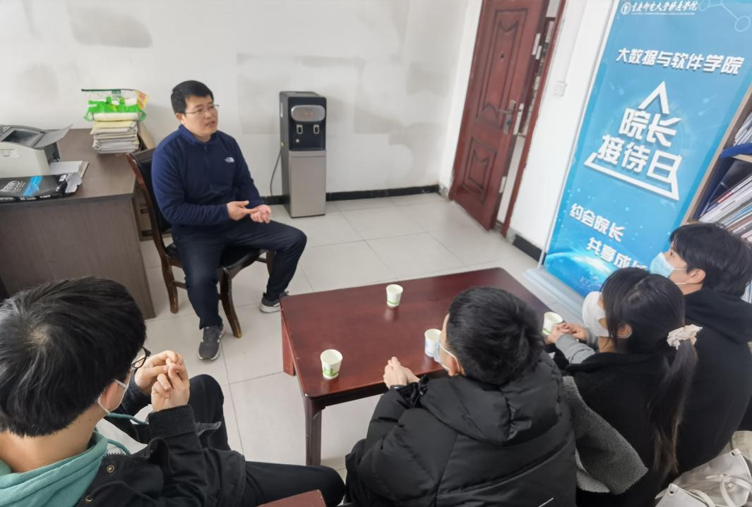 阳春布德泽,万物生光辉。春暖花开之际,同学们踏进校园,迎来了新学期。为在开学之初端正同学们的学习态度,指导同学们做好新学期规划,大数据与软件学院于3月1日举办了院长接待日,4名2021级计算机科学与技术专业的学生代表向大数据与软件学院教学副院长闫会峰老师进行咨询学习。