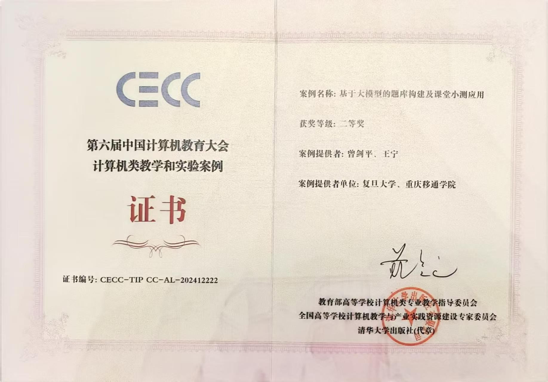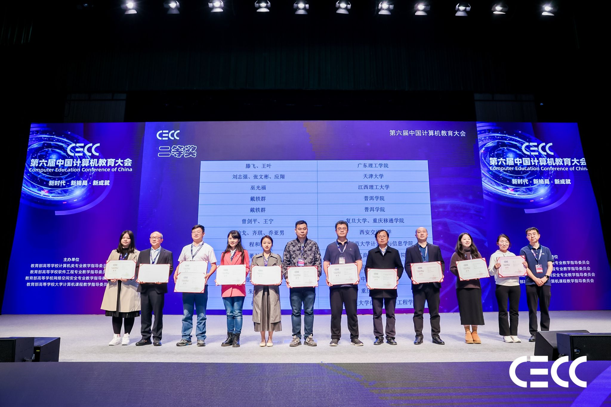 值得一提的是,在大模型与数字化教学分论坛上进行了第六届中国计算机教育大会计算机类教学和实验案例颁奖仪式。信息安全学院王宁与复旦大学曾剑平教授联合申报的案例荣获“计算机类教学与实验案例二等奖”。这一奖项表彰了王宁在计算机教学案例设计中的卓越贡献,也进一步证明了信息安全学院在计算机教育创新领域的不断革新。