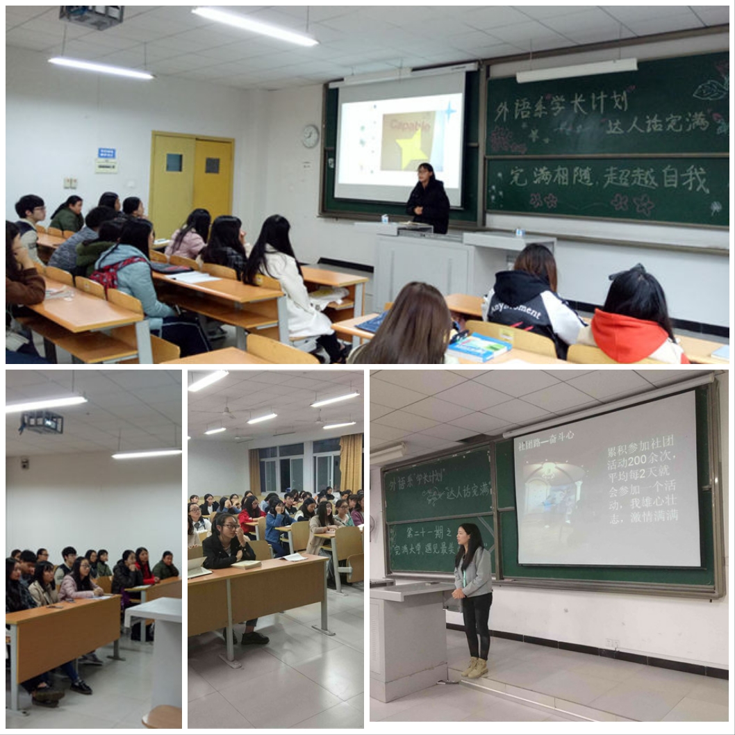 外国语言文学系以奋斗、学习为主题 “完满大学,遇见最美的自己”分享会、德语专四分享会。以技能培训为话题开展了策完满之路,P精彩人生”培训会、“新生杯”辩论赛培训会、摄影培训会。通过各类培训,激发学生的学习乐趣,学会根据自身特色挖掘自身兴趣点。