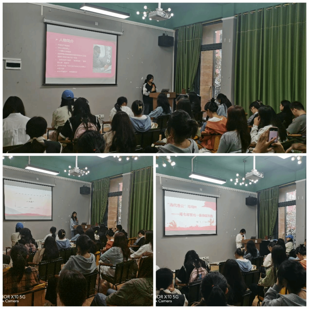 本次活动共有7位学生代表做了主题发言,分享新时代的发展变化,在经济,政治,文化,社会,生态等各方面所取得的成就,以及新时代奋斗故事。以王璐瑶、王敏、张艺、胡羽莱为代表的四组同学,分享了新时代取得的历史性成就。陈俊玲同学以“共话中华好,奋进新时代”为题,讲述了时代楷模黄文秀的先进事迹。梁小琴同学分享了时代楷模钟南山的先进事迹。刘春燕同学分享了扎根基层一线的脱贫攻坚楷模毛相林的先进事迹。
