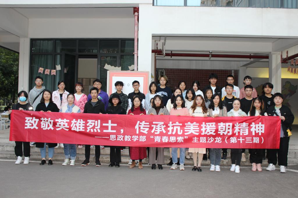 为纪念中国人民志愿军抗美援朝出国作战70周年,传承抗美援朝精神,思政教学部德育教研室于11月18日下午4点30分在鱼城书院A12会议室举行了题为“致敬英雄烈士,传承抗美援朝精神”的学生“青春思索”主题沙龙活动。德育教研室全体教师及2020级30余名学生代表参与了本次活动。
