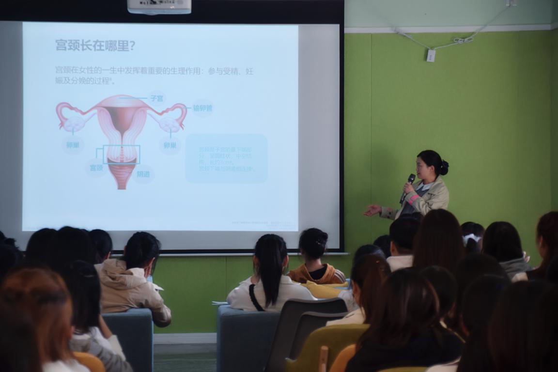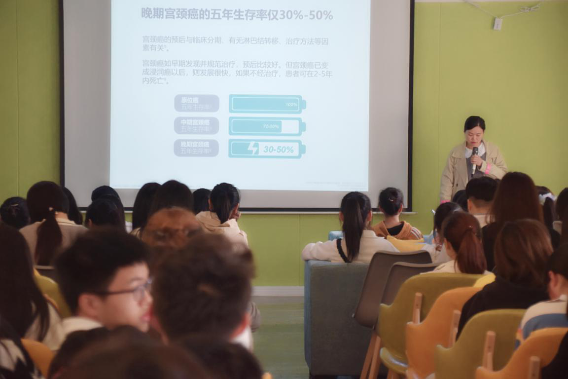 你知道吗?宫颈癌已成为发病率和死亡率仅次于乳腺癌的女性器官恶性肿瘤,已经成为威胁妇女健康的一大杀手,但大家无需过于紧张,因为宫颈癌也是目前唯一一个可以治愈和预防的恶性肿瘤。王医师凭借多年丰富的教学与临床经验,就中国宫颈癌疾病概况、发病原因、易患人群,以及宫颈癌的防治等方面进行宣讲。工作人员提前给每一个座位上放置了一本宫颈健康宣传手册,同学们结合手册上的知识与王医师的讲解,将宫颈健康知识铭记于心,明白爱自己,越早越好,而不仅限是宫颈癌这一疾病。