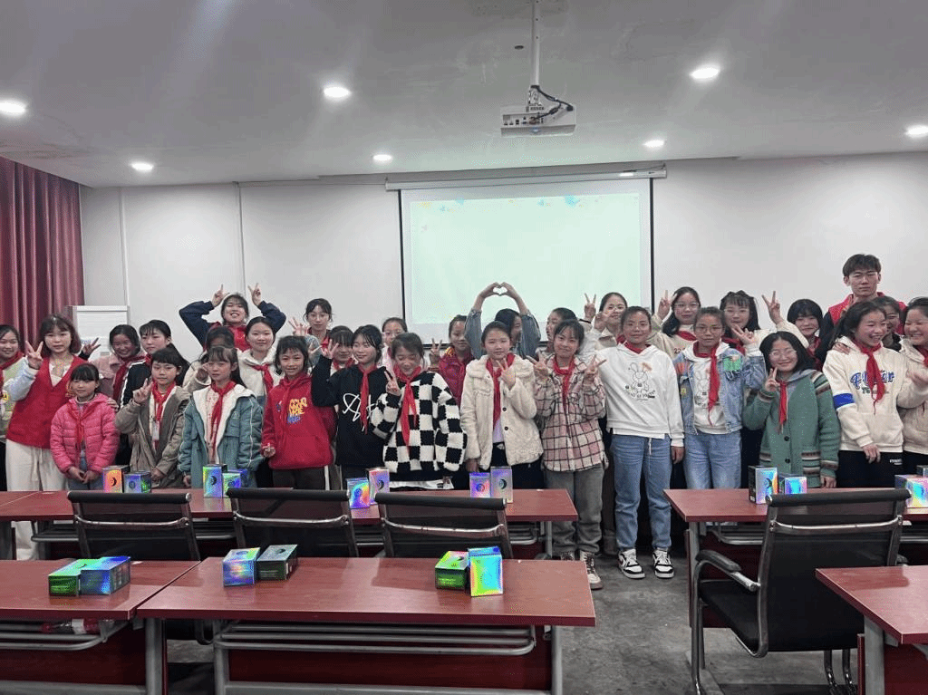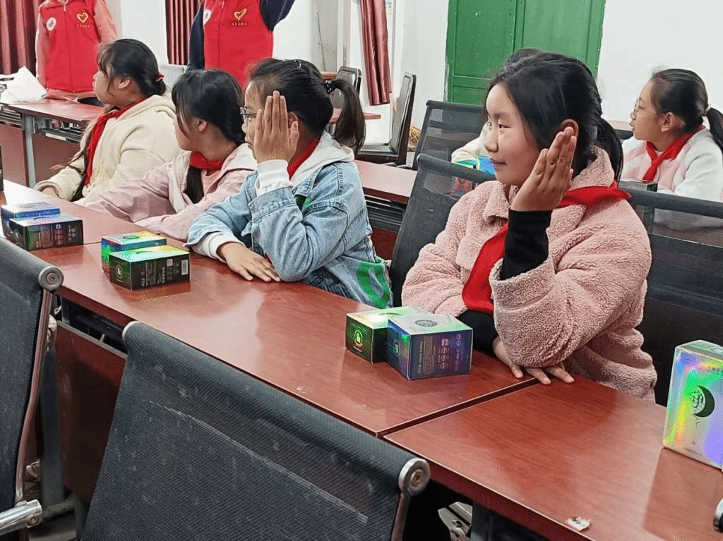 知识讲解结束后,志愿者们将带来的卫生巾等物资,发放给每一位小朋友,大家的脸上都洋溢着灿烂的笑容。“我觉得哥哥姐姐们今天的讲课对我们的帮助很大,让我们懂得了很多新的知识,谢谢你们!”一位热情的小女孩露出她尖尖的虎牙,笑着对志愿者们说道。