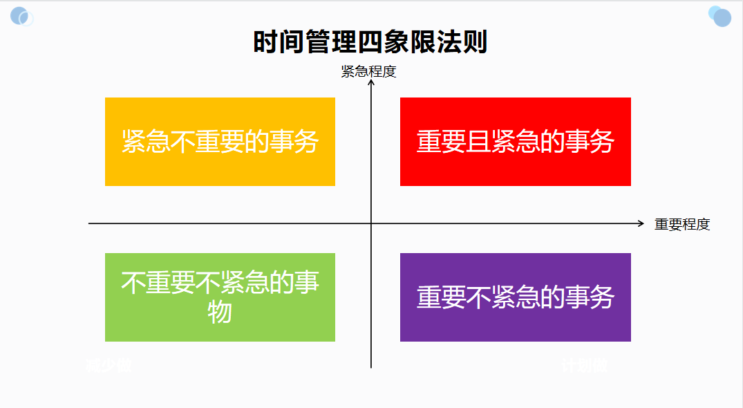 交流会上,杨宝石导师为同学们介绍了管理大师彼得德鲁克的著作《卓有成效的管理者》,分析了管理工作怎样才能做到有成效。同时以“时间管理”为切入点,和学生们分享如何管理自己的时间。杨宝石导师以“时间四象限”法则为例,让学生们讨论“重要不紧急事项”和“紧急不重要事项”的优先级。同学们各抒己见,表达自己对时间管理的看法。