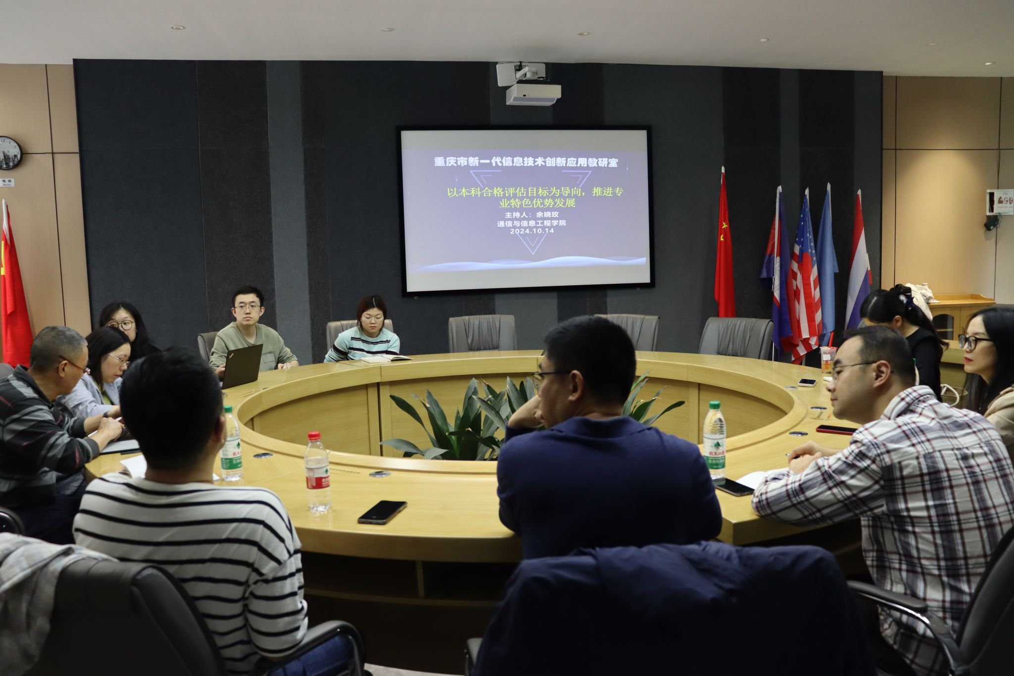 2024年10月14日,新一代信息技术创新应用(虚拟)教研室成员单位成都信息工程大学王海江教授、杨波教授、徐梓欣副教授一行来我校交流,在南湖书院圆桌会议室开展“以本科合格评估目标为导向,推进专业特色优势发展”的主题研讨会。参会人员包括重庆移通学院通信与信息工程学院院长李文娟教授、副院长唐林建副教授、虚拟教研室负责人余晓玫教授,教研室其他成员以及专业负责人,会议由余老师主持。