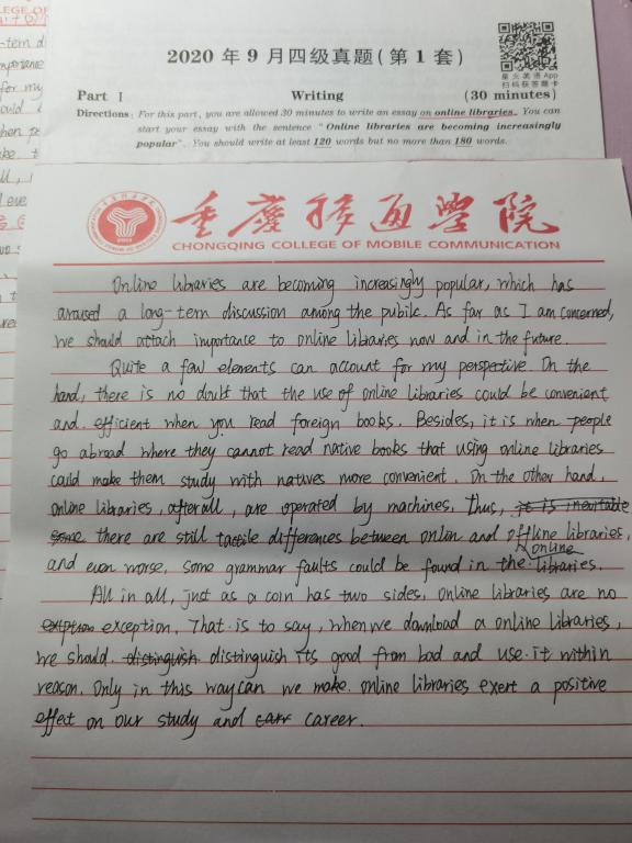 为使本次培训更加具有针对性,税青老师在前期与同学们的沟通交流中就注意对其英语学业基础进行摸底,进而有了较为全面的了解,也为本次培训会的成功举办打下了良好基础。同时,也鼓励同学们放平心态,夯实基础,树立功在平日的学习观念。令人欣慰的是,部分同学的确体现出较高的学习热情,冯婧怡、黄治森等同学陆续自主撰写四级作文给老师更改评阅,税青老师也通过面授、电话等多种形式对同学们进行具体指导,每次讲解时长均在半小时到一个小时。