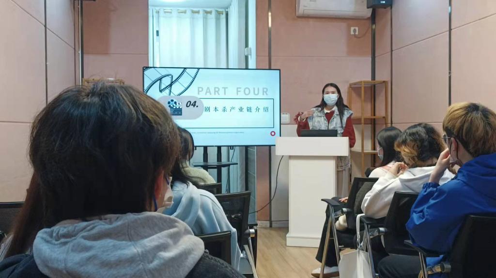 第一次开营活动上,在近20位同学的满心期待中,幸李寒导师向初次接触剧本杀的同学介绍了该游戏,幸李寒老师告诉大家,王牌综艺节目《明星大侦探》以及口碑与票房双丰收的电影《扬名立万》表现的正是当下“剧本杀”游戏的风靡盛况,剧本杀已成为时下大受年轻人欢迎的演绎式娱乐项目。谭雪导师则从“剧本杀产业链”角度,介绍了剧本杀从创作、发行、运营等环节,让同学们对自己喜爱的娱乐项目有了较为全面的了解。