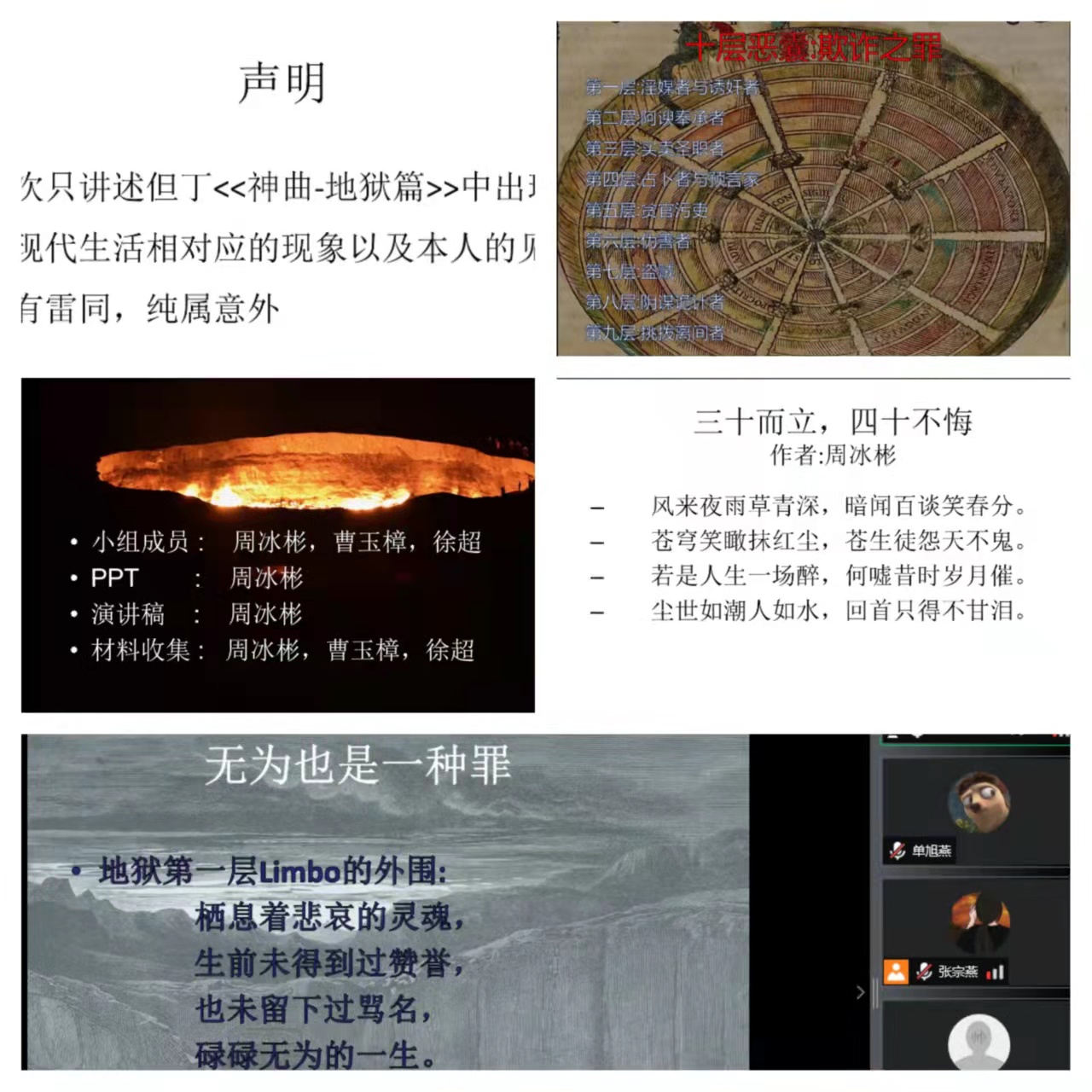 为落实学校疫情防控要求,本期读本精研活动通过腾讯会议在线上展开,由通识教学部单旭燕和黄揽月两位老师带领20余名同学共品但丁的经典著作《神曲》,虽然隔着屏幕,但丝毫不影响大家的学习热情,各小组从不同的角度品读并依次陈述《神曲》的经典之处。