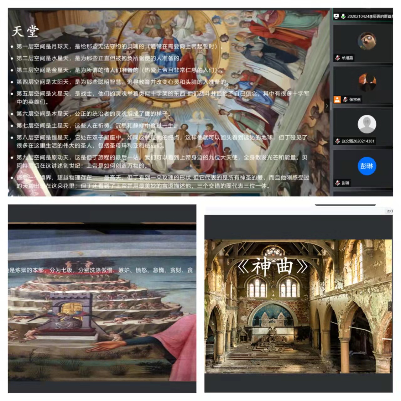 2020级数字媒体技术徐浩天、邱帅与吴宏宇同学均以对比的视角,分别从神圣到世俗,从但丁到尼采,从《神曲》到《西游记》等层面,为大家展现了不一样的思维角度。徐浩天同学强调了但丁的天堂之行,也是当时人的度化之旅,去向天堂之路就是他们接近真善美的征途,对真善美的表达便是对当时中世纪某些思想的反对。吴宏宇同学主要展现了尼采与但丁对理性、欲望、意志等观点的不同表达,提到在这个理性为主导的时代,人与人之间并未因科学技术的革新而拉近,反而越来越远。当下社会中我们应该关注到周围的人,关注到个人的情绪,而不是一味的强调理性而忽视了个人意志的体现。邱帅同学结合《西游记》与《神曲》,对比分析前者的天庭观与后者的天堂观,展现东西方对幸福向往的不同。《西游记》中的天庭是封建时代末期世俗生活的展现,《神曲》中的天堂是一个超现实的向往,代表光辉与思想的永恒。