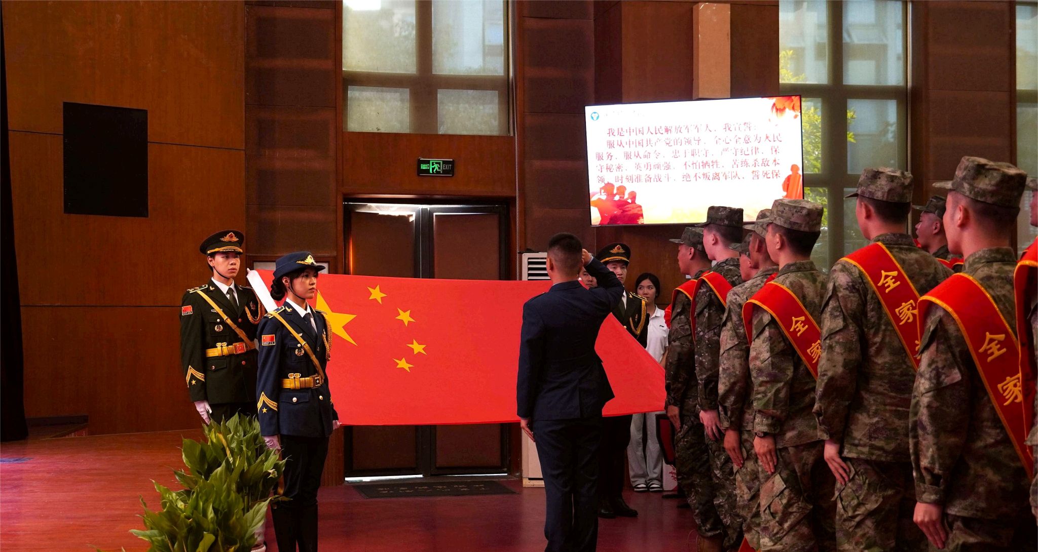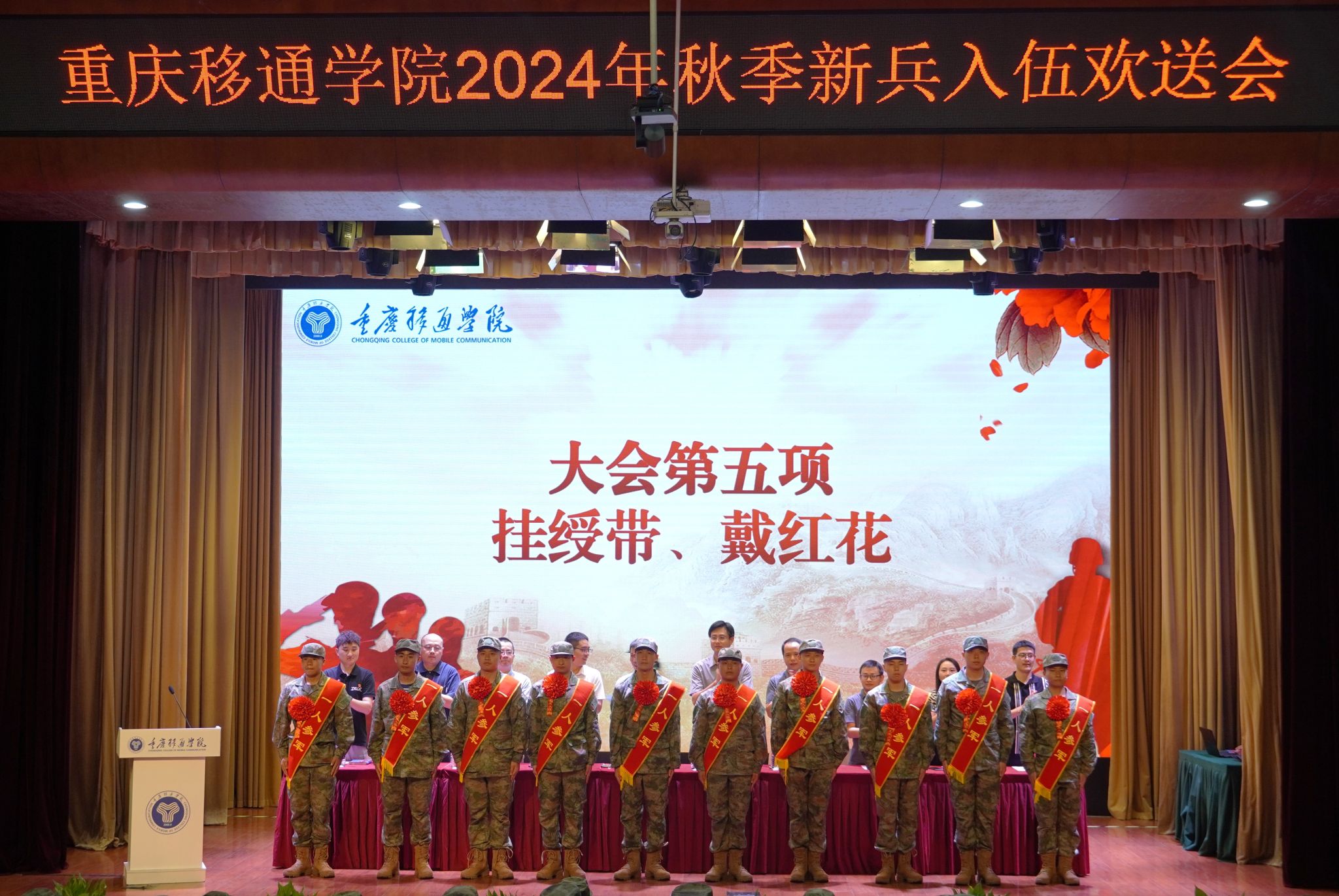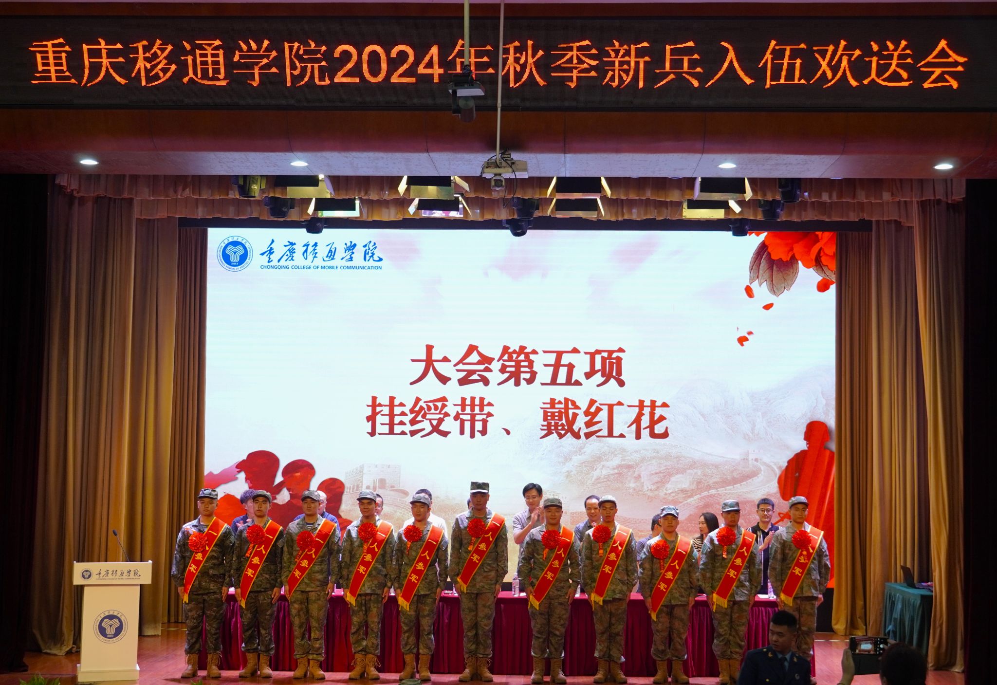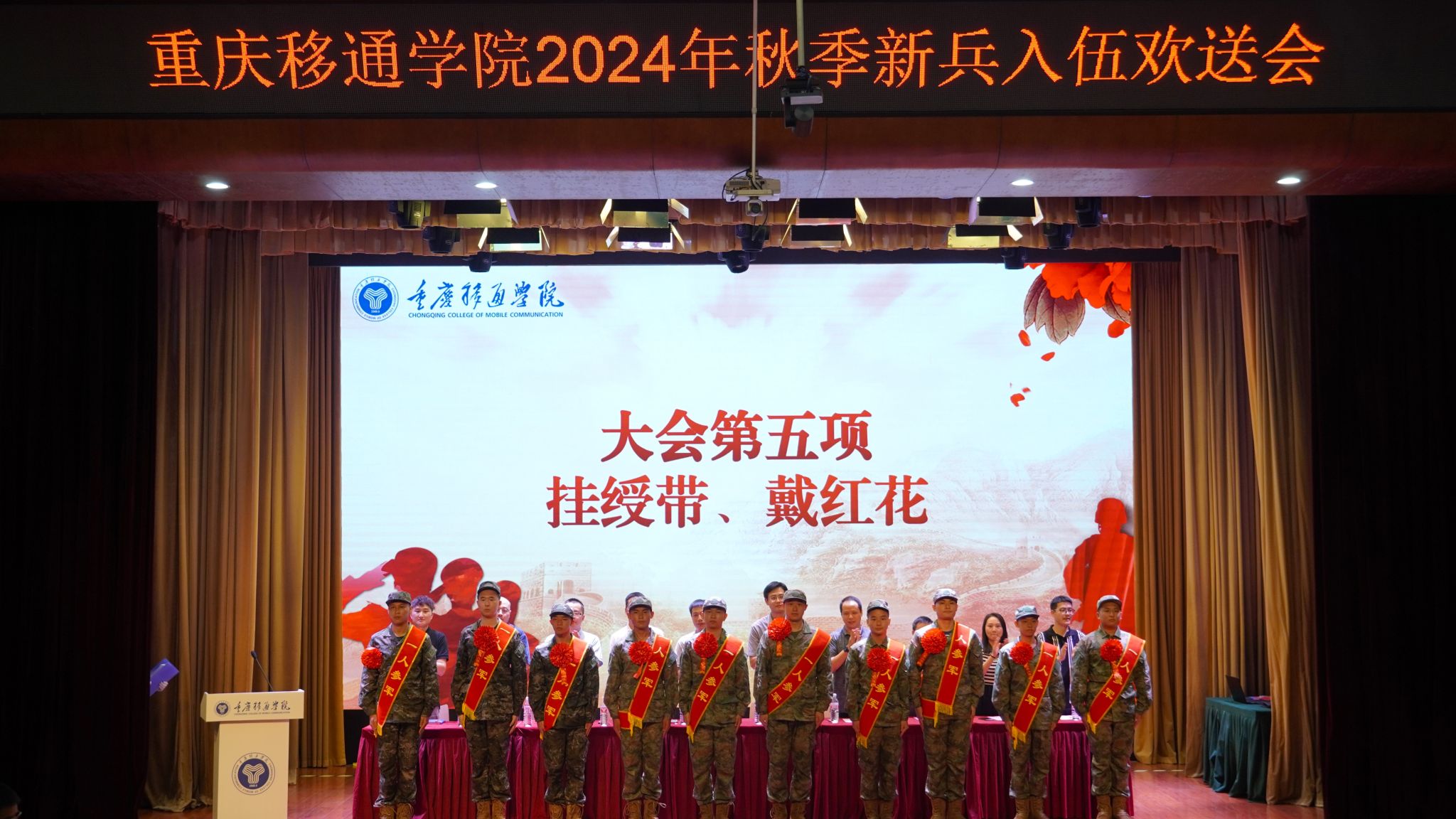 时代之潮,激荡强军力量。学校领导共同为每一位新兵佩戴入伍绶带和大红花,表达了对新兵同学深深的祝福和希望。32名新兵身着戎装、肩披“参军光荣”绶带,意气风发、精神抖擞,脸上洋溢着青春的热情,眼中闪烁着坚定的光芒。他们即将奔赴祖国大江南北,履行保家卫国的神圣使命。愿他们的军旅生涯,如同这红花般绚烂,如同这绶带般荣耀,成为人生中最璀璨的篇章!