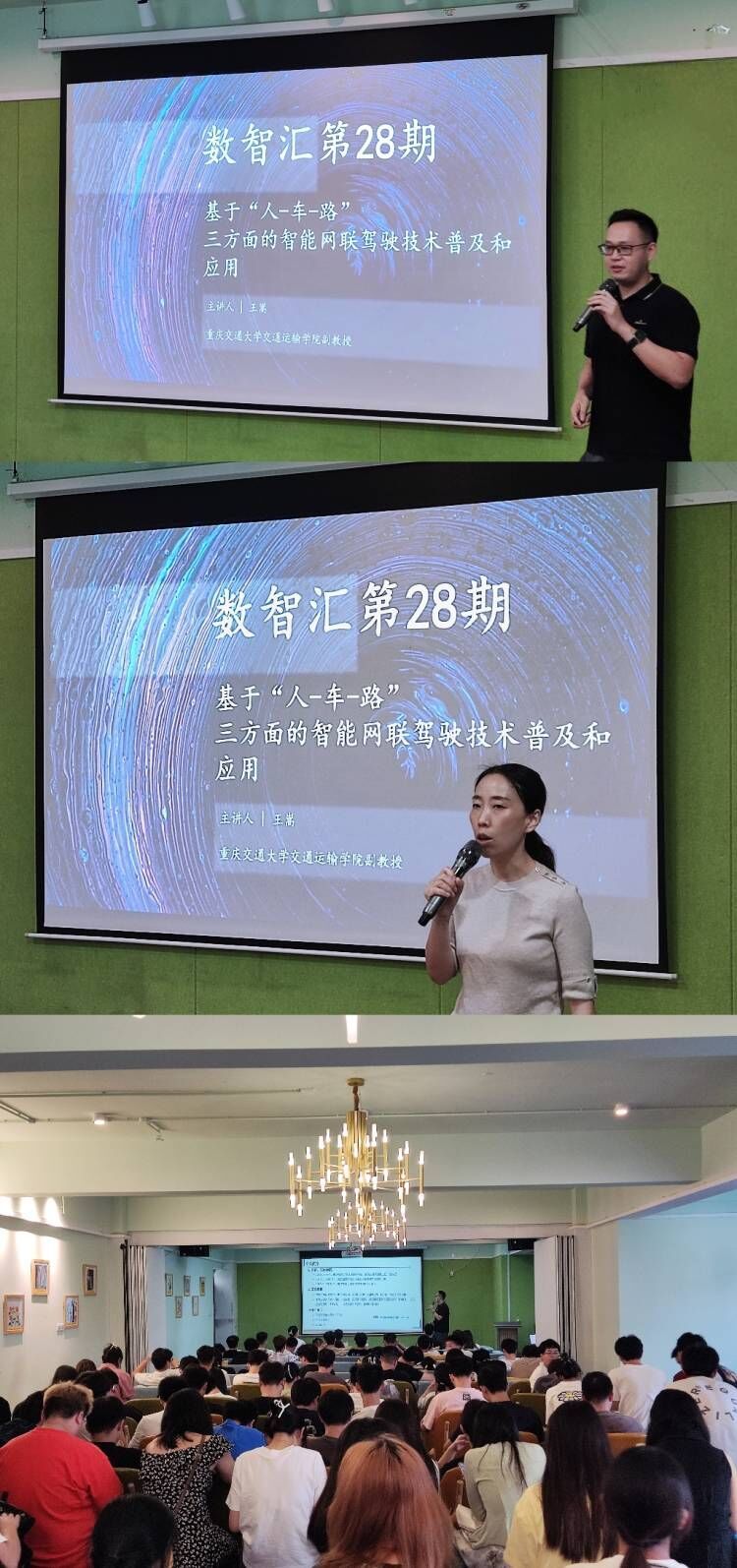 为进一步推动数字经济与信息管理学院的专业深化与发展,强化学生专业素养与能力,本学院于6月12日上午10:00在双栀书院多功能影音室隆重举办了“数智汇”系列讲座第28期。本次讲座特邀了重庆交通大学智慧交通系专业负责人、美国路易斯维尔大学交通工程博士、硕士生导师王嵩副教授担任主讲嘉宾。他以“基于‘人-车-路’三方面的智能网联驾驶技术普及和应用”为主题进行了深入且专业的探讨讲解。讲座由工程管理教研室主任周梦娇主持,工程管理专业的教师代表及学生代表悉数出席,共同聆听了这场学术盛宴。