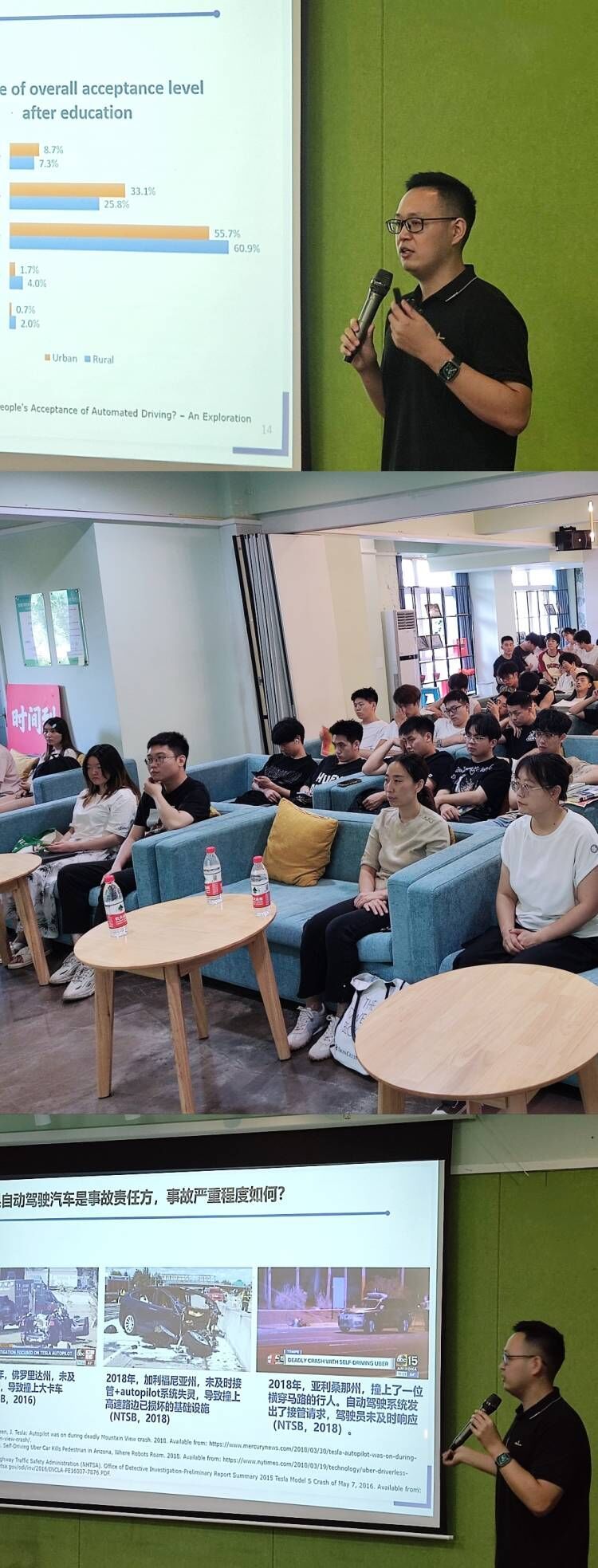 讲座伊始,王嵩副教授首先向与会师生详细介绍了其丰富的教育工作经历、当前的研究项目及主要研究方向。他深入阐述了《智能汽车创新发展战略》的核心内容,并详细解读了AV4.0的理念,强调了智能网联汽车对于未来交通系统的重要价值。以智能网联汽车为切入点,深入探讨了自动驾驶技术正是人机共驾时代的进行时并解释了自动驾驶技术不同等级及其所代表的技术成熟度与功能范围,为师生们提供了清晰的技术分级认知。就自动驾驶车的事故分析与实际案例方面进行了系统介绍。并将从“人、车、路”三个不同视角出发,详细阐述自动驾驶技术所面临的机遇与挑战。