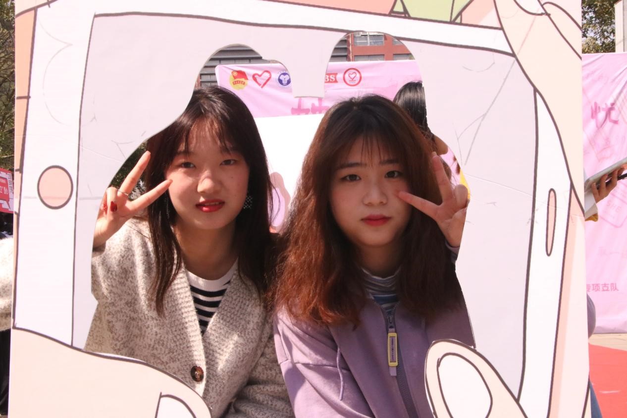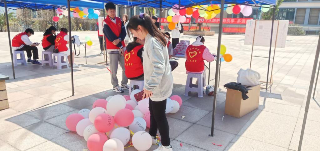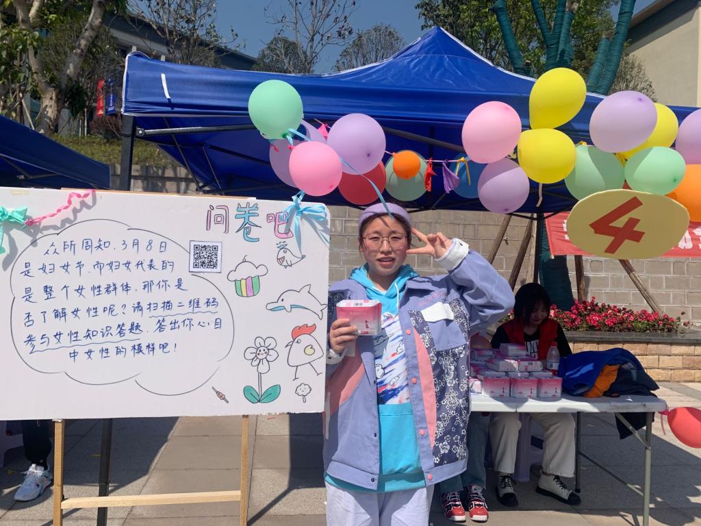 綦江校区图书馆广场粉色长廊更是通过摇号领取的方式领取卫生巾,风采视频、便签祝福、微笑打卡等互动形式趣味十足,现场还设置了“打破女性束缚”的踩气球游戏,鼓励女性师生勇敢打破传统,跳出桎梏。