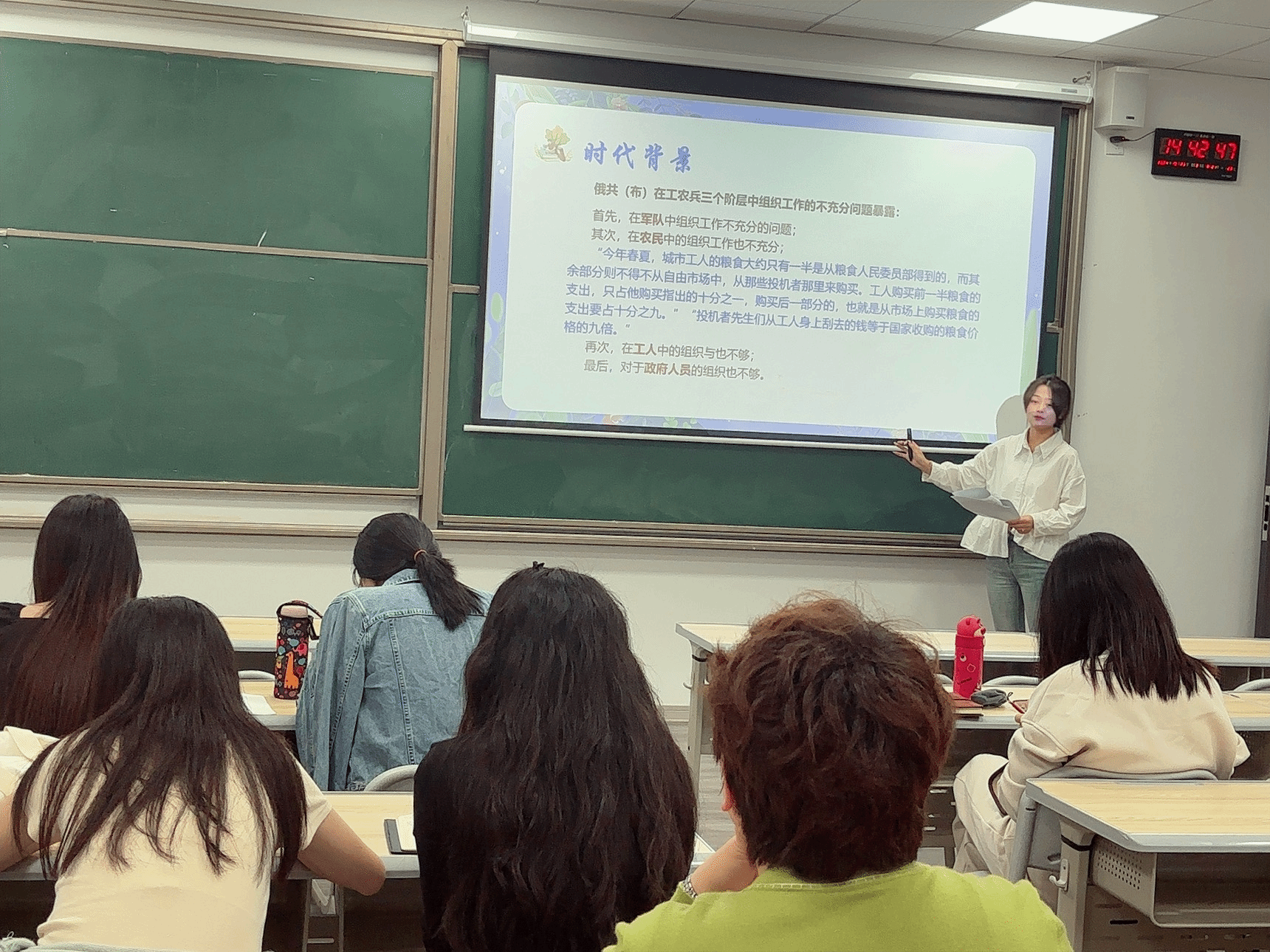 研读过程中,严倩倩老师从新经济政策的历史背景入手,分析了苏俄在经历了一战和内战之后的严峻形势。列宁在这一时期提出了新经济政策,以应对农民对余粮收集制的强烈不满和工人阶级的困境。该政策的实施有效地缓解了城乡之间的矛盾,恢复了国民经济,增强了苏维埃政权的合法性和稳定性。随后,严老师深入探讨了新经济政策的实质和成效。新经济政策不仅是对内战时期极端政策的调整,更是列宁根据实际情况灵活运用马克思主义原理的典范。通过实行粮食税,减轻了农民的负担,激发了农业生产的活力;通过允许私人经营和国家资本主义的实践,促进了工业的恢复和发展;通过发展合作社,加强了国家与农民之间的联系,为社会主义的建设积累了宝贵经验。