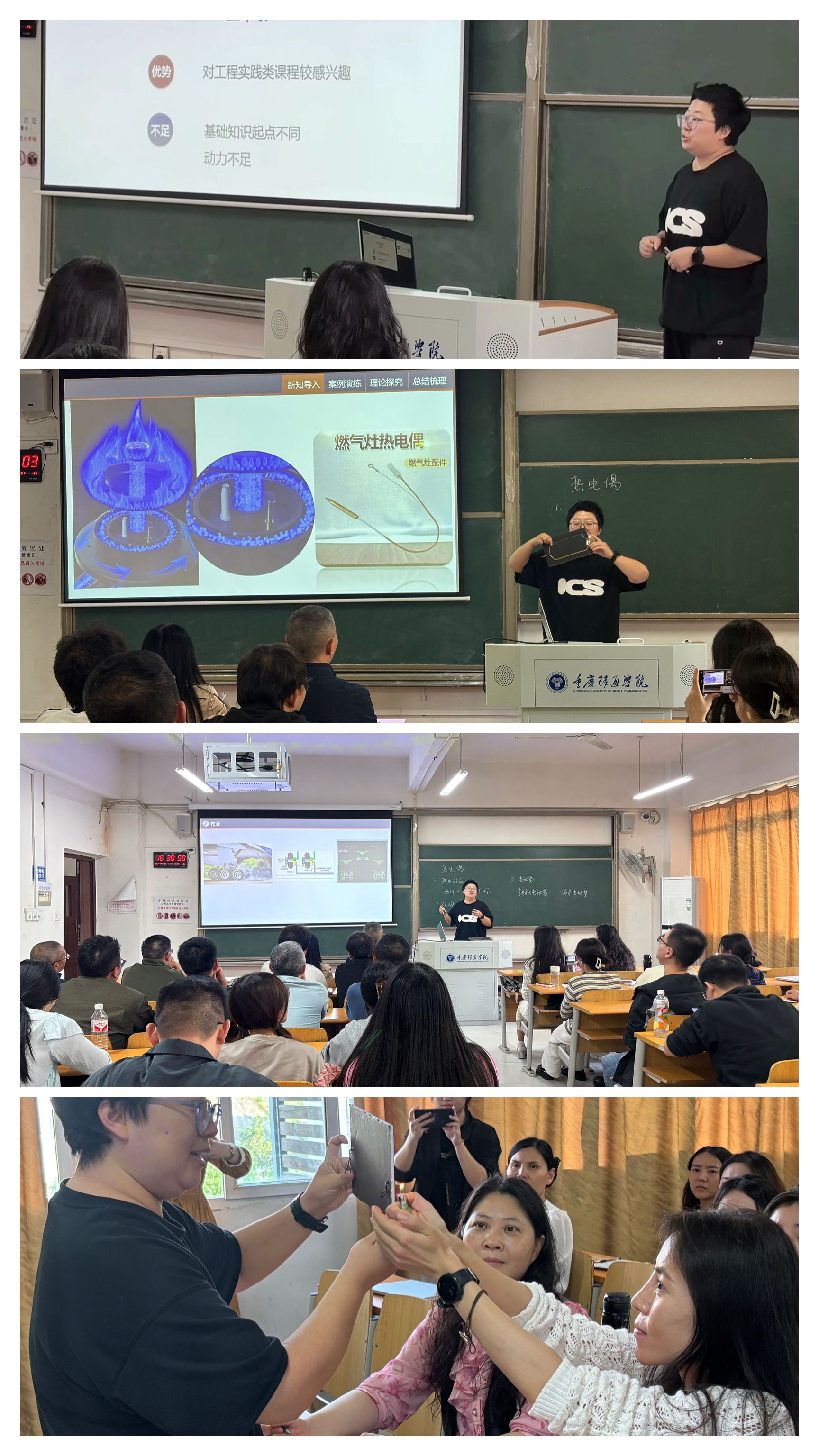 紧接着,程彩玲老师正式开始了她的示范性课程讲课。程彩玲老师以“传感器原理及应用”课程中的“热电偶”章节为核心,为在座的教师们呈现了一堂生动有趣、深入浅出的示范课。程老师首先从学情分析入手,指出学生对工程实践类课程有较高的兴趣,但存在基础知识起点不同和动力不足的问题。她强调了课程定位的重要性,即在教学中要注重基础和应用的结合,以及“学思融合”的教学理念。程老师明确了课程的教学目标,期望学生不仅能够掌握热电效应的基本原理和热电偶的基本结构及特性,更能培养出一种敢于质疑、独立思考、严谨求实的科学精神。