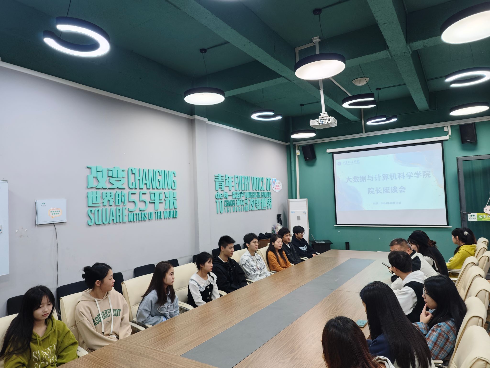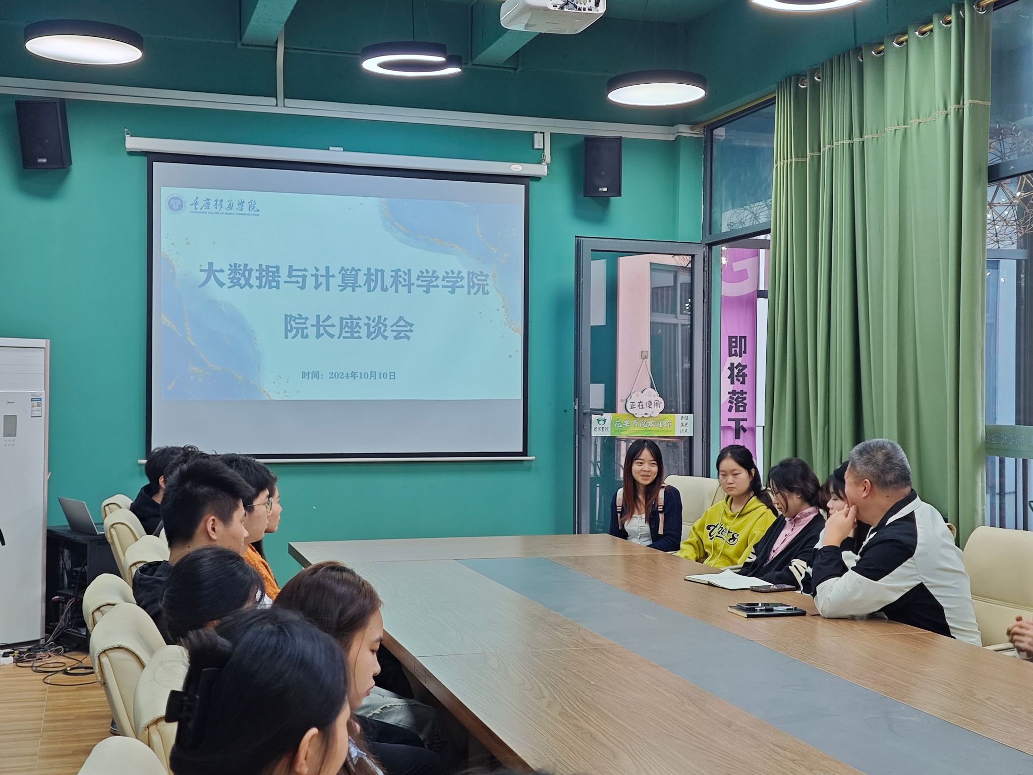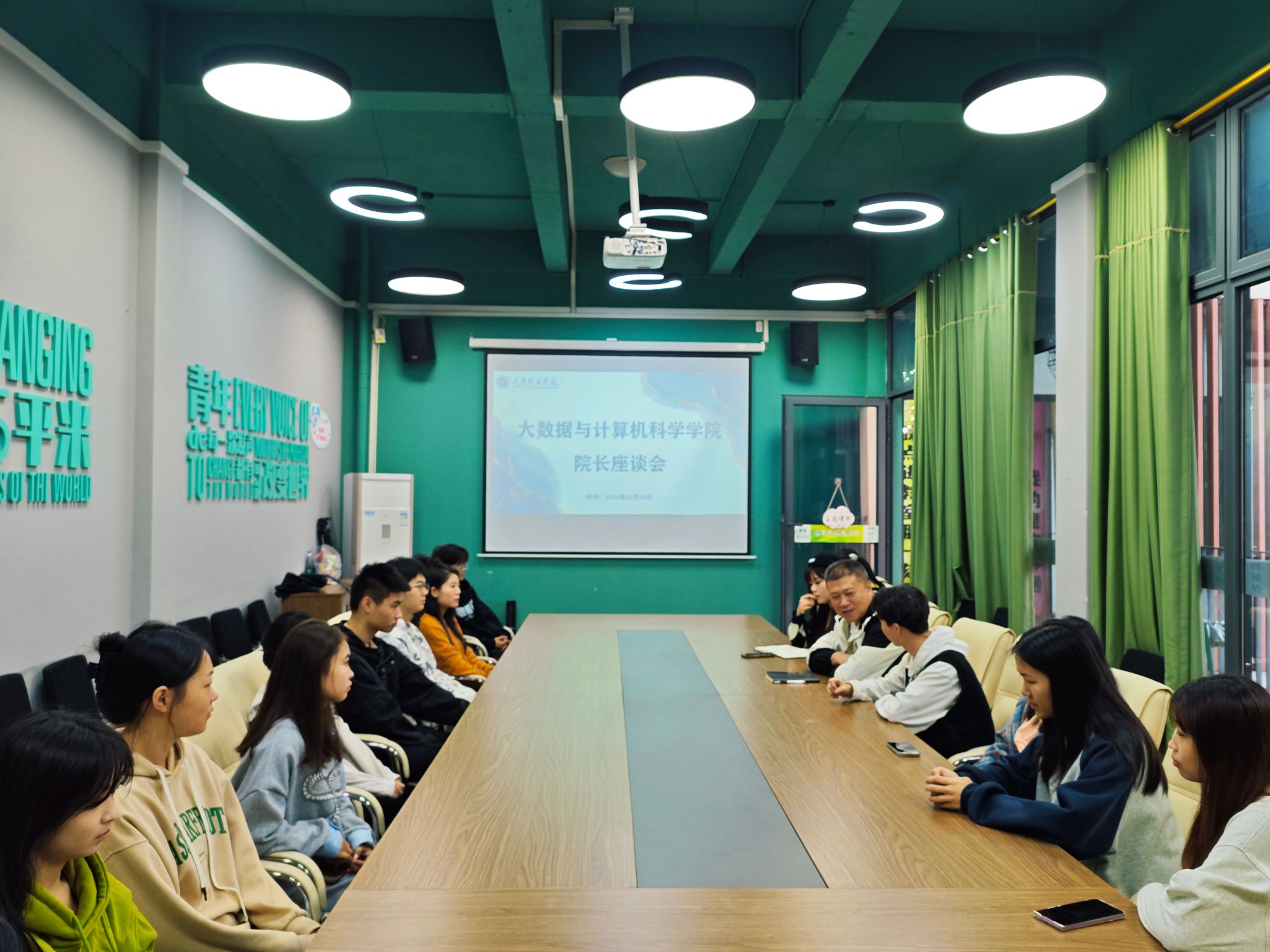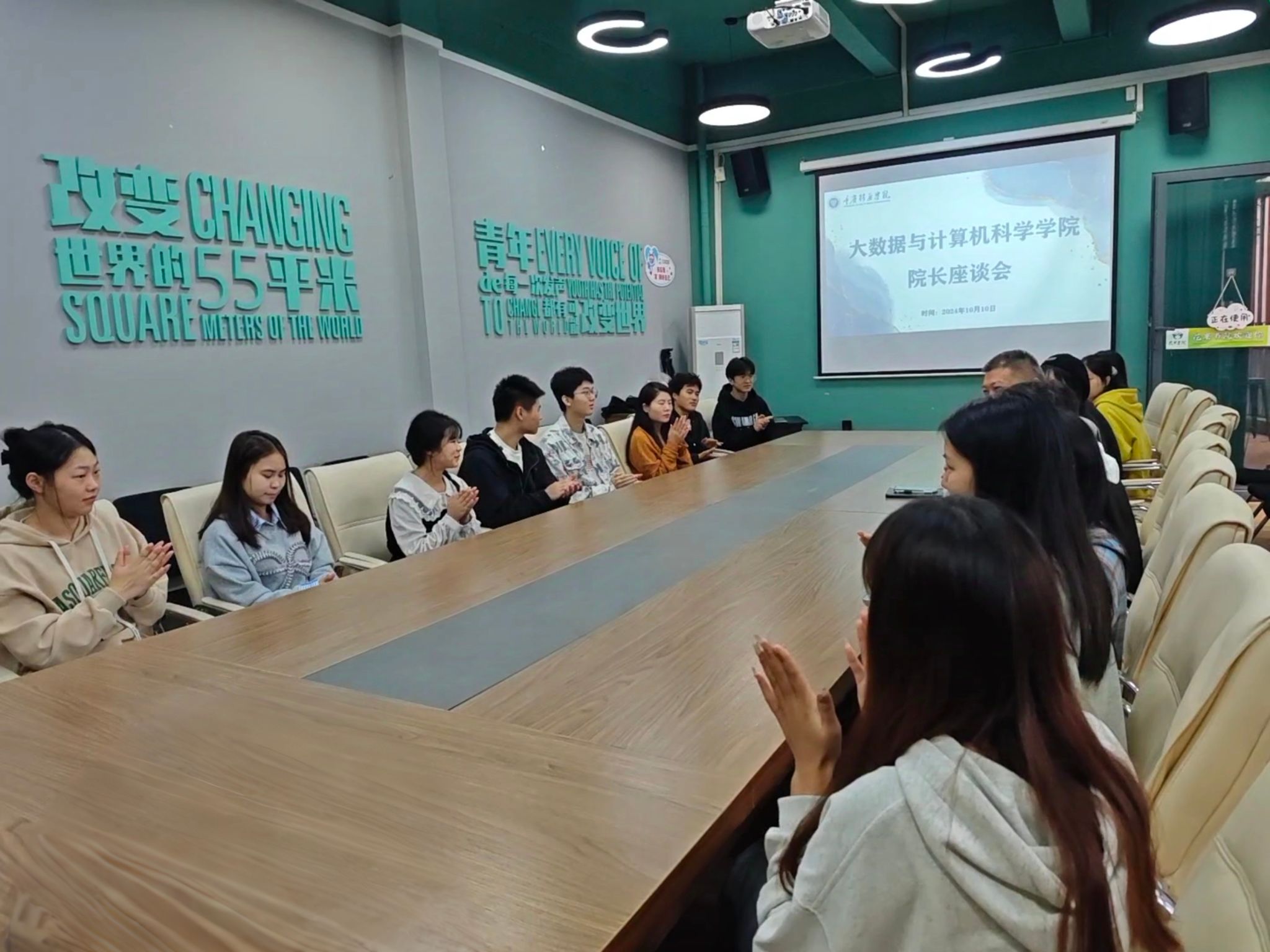 师生面对面,沟通零距离。为进一步拉近师生距离,搭建师生沟通的桥梁,了解学生近期在思想动态、个人发展、生活状况中的问题,切实解决学生急难愁盼问题,用心用情做好学生工作。10月10日10:00,大数据与计算机科学学院在花果书院大型会议室开展院长座谈会,大数据学院院长潘显兵、大数据与计算机科学学院2025届辅导员彭崇清以及学院2025届全体在校学生参加座谈会。