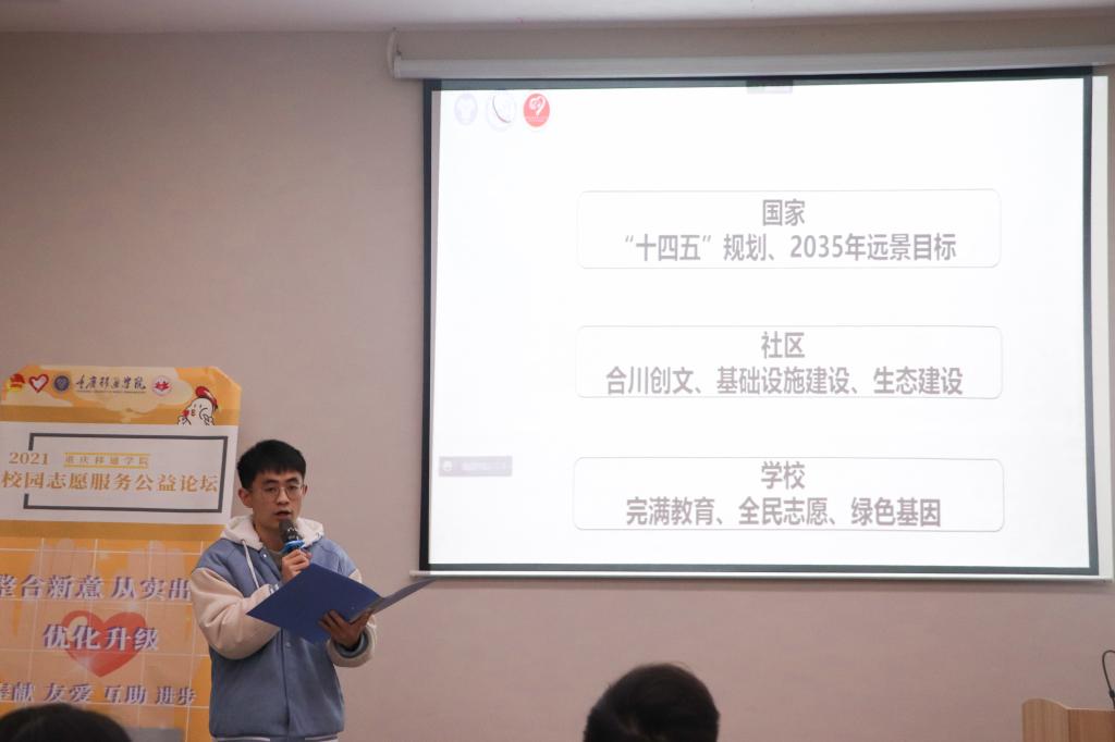 随着我校志愿服务的不断发展,志愿服务项目在社会实践中发挥着日趋重要的作用。为展示我校志愿服务项目风采,推动志愿服务项目系统化、专业化、融智化发展,多维度、多领域探索志愿服务发声技巧,校团委联动綦江校区于12月23日在南湖书院智慧教室以线上加线下的形式围绕如何包装运营志愿服务项目、志愿服务对外发声技巧等内容开展了2021年校园志愿服务分论坛。本次论坛由谢海山教授、校院两级志愿服务板块指导老师以及优秀志愿服务项目负责人参与,共计200余人。