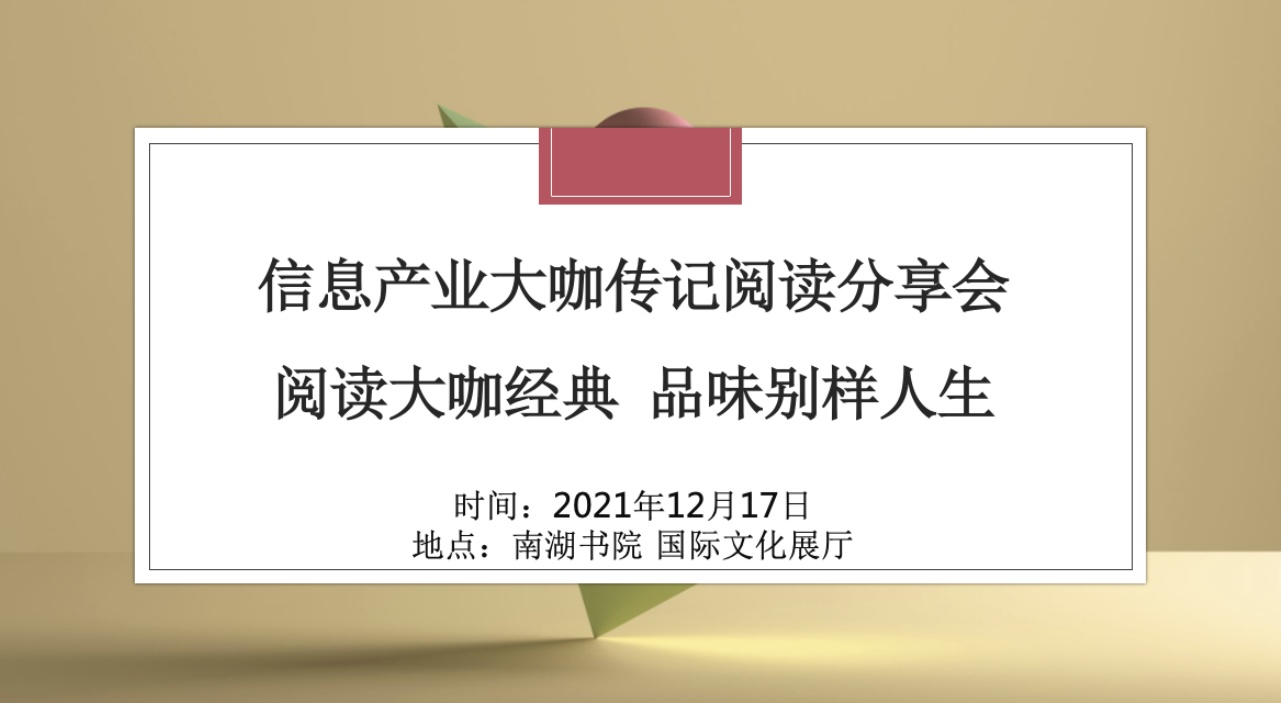 为积极响应我校“信息产业大咖传记阅读计划”,拓展学生眼界,培养学生商科思维,熊光源异科导师小组成员于12月17日上午在南湖书院国际文化展厅进行以“阅读大咖经典 品味别样人生”为主题的大咖传记阅读分享会。