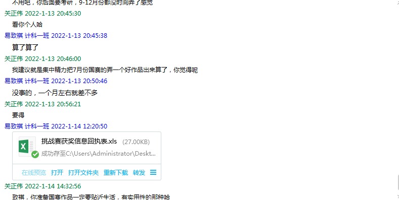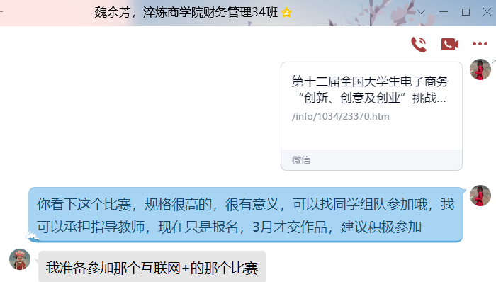 张红老师通过在QQ里转发第五届全国大学生创新体验竞赛校内选拔赛的通知,鼓励有兴趣的同学积极组队参赛,并结合上学期对同学们个人大学规划的了解,有针对性地引导大家参赛,提高个人能力。其中,本组魏余芳同学表示正在准备参加“互联网+”及“商道”比赛。