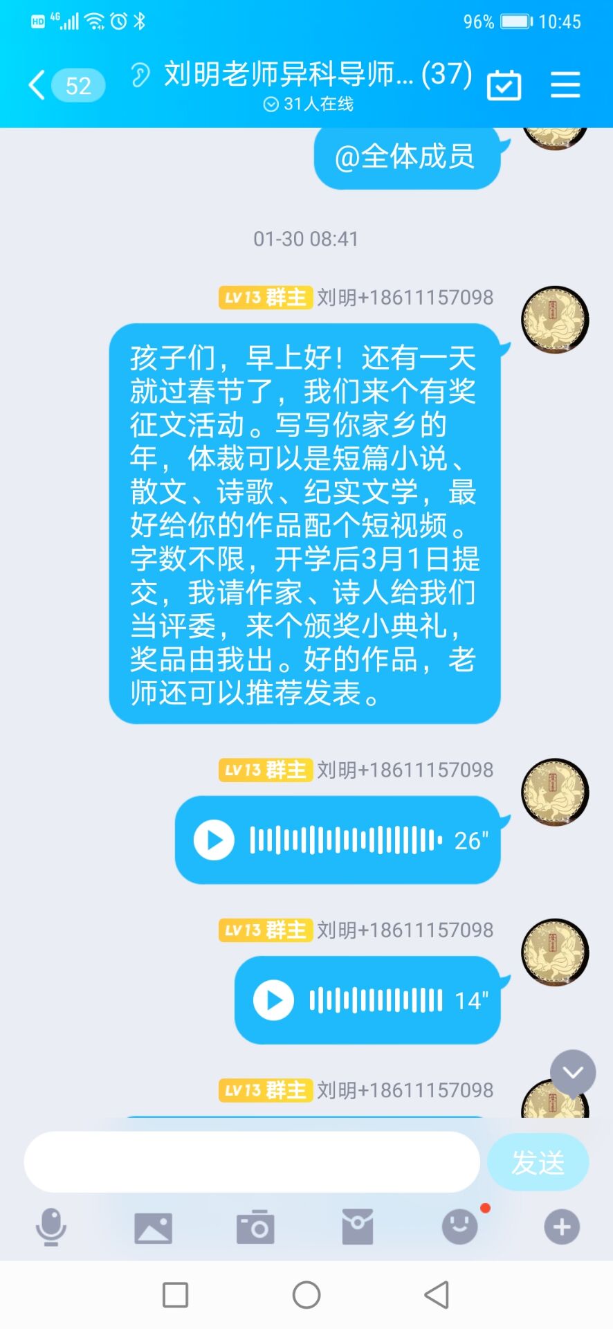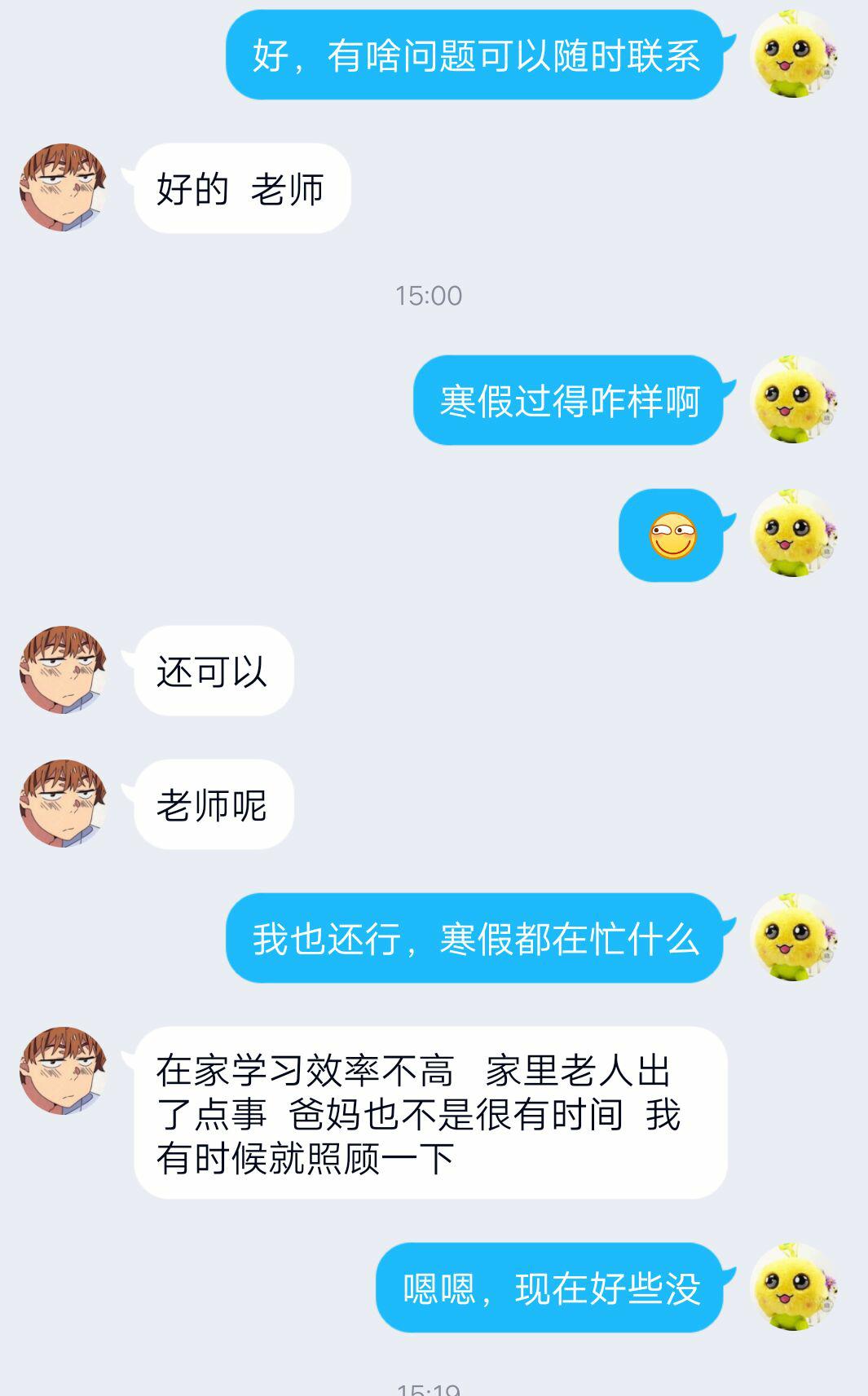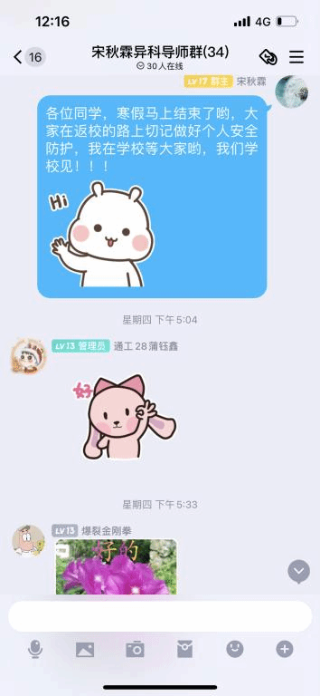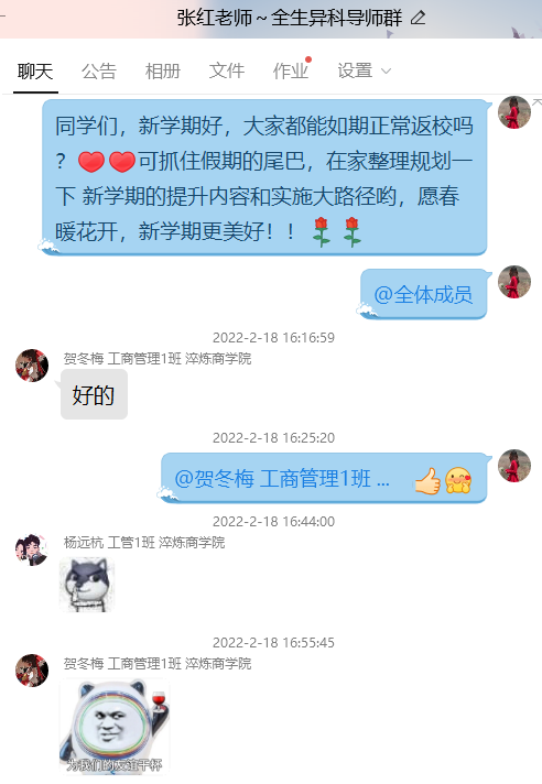 老师们还时不时关心学生假期生活状况、安全问题和心态问题等等,此外还开展了多样化的拜年问候,诸如互发红包、互送祝福等等。