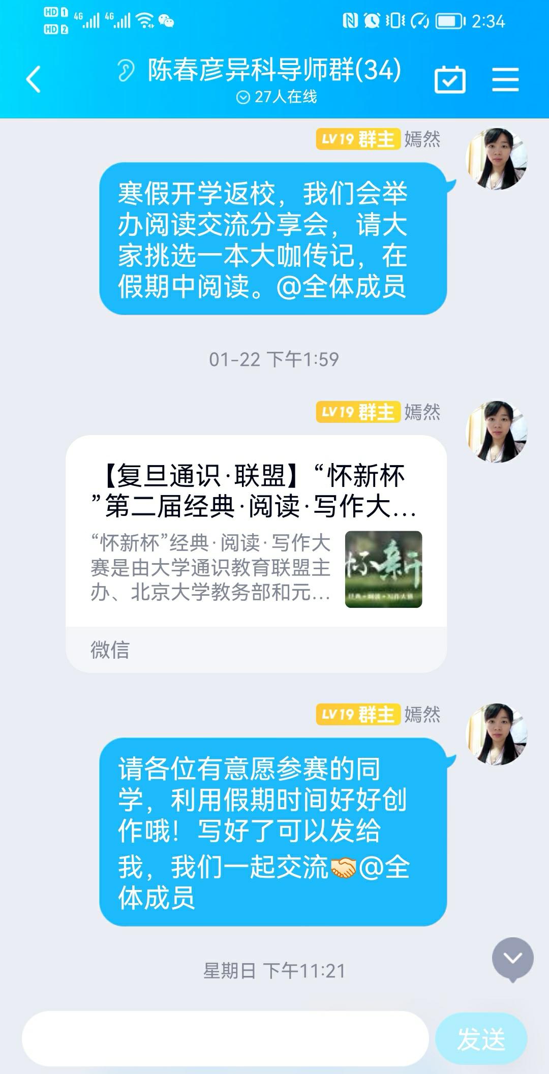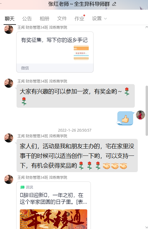 同时,本组王阅同学,在QQ群里与大家转发互动自己主办的“写下你的返乡手记”、“年味移通”系列活动,年味浓厚,张红老师提醒同学们,做好个人疫情防控,可整理规划一下 新学期的提升内容和实施路径。