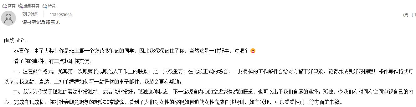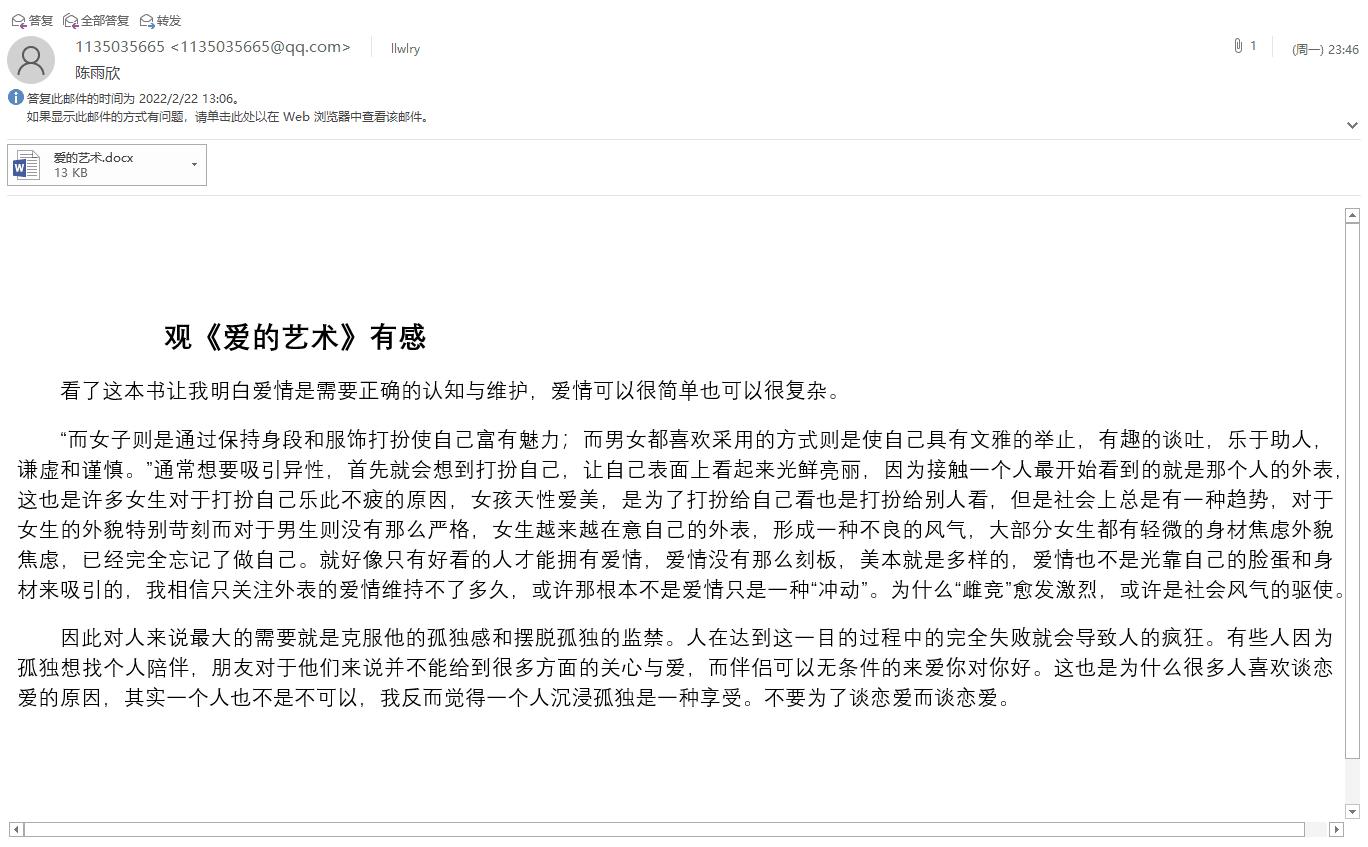 寒假期间的异科导师交流活动,是学校育人向校园外的一种延伸,为加强学生之间的互动交流,增进导师与学生之间更加深入的了解,刘玲炜老师放假前给同学们推荐了《爱的艺术》这本书,这本书是心理学家弗罗姆的心理学著作。刘老师借此书所表达的对于人格塑造和爱的能力的培养,鼓励同学们大学期间努力培养完善自己的人格,发展爱他人的能力,并树立大学目标,刘老师希望学生能形成较好的爱的观念,从而获得幸福,很多同学在刘老师的指导下在假期阅读并完成了阅读报告。同时,针对部分学生《艺术设计史》挂科情况,刘老师假期期间从自身经历出发,与其交流学好专业课的重要性,并鼓励学生在大学期间尝试不同爱好,找到自己真正的热爱。