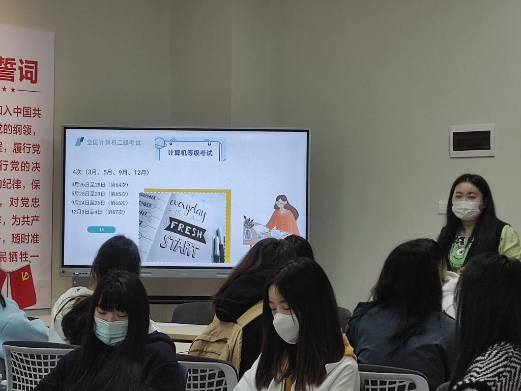 另外朱老师希望同学们能够参加的心理健康教育与咨询中心相关活动,初步拟定为舒压类,做一些释放压力的绘画团辅,大家从上学期就很期待这项活动,希望尽快能参与到这项活动中。针对同学们普遍关注的大学英语四六级考试和计算机等级考试,朱老师给大家确切分析了本学期具体的报名时间和考试时间,如英语四六级考试倒计时94天,提醒参加考试的同学从现在开始制定复习计划。根据班级课表和导师课表确定活动时间,分析同学们可以利用的自主学习时间,为以后就业早做打算。