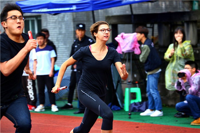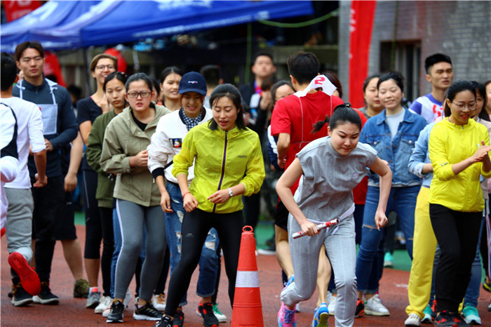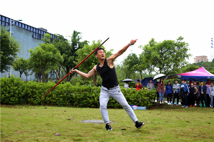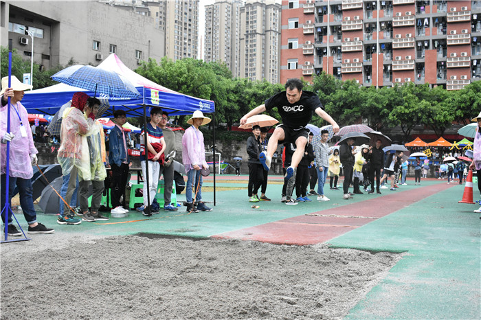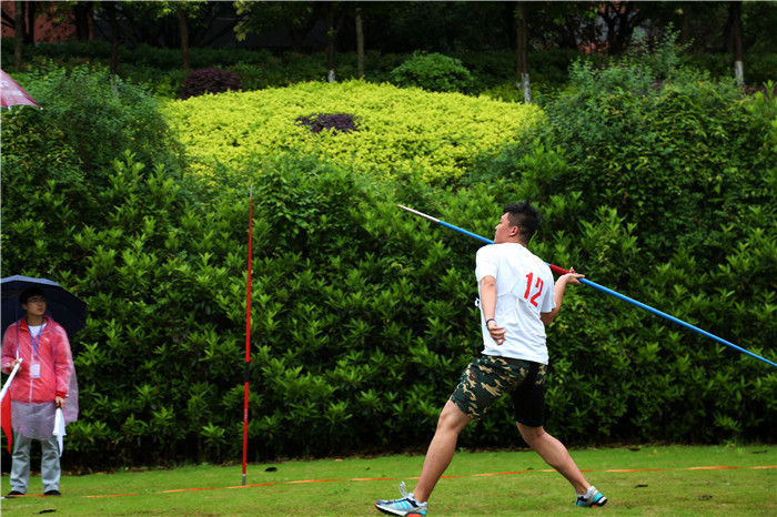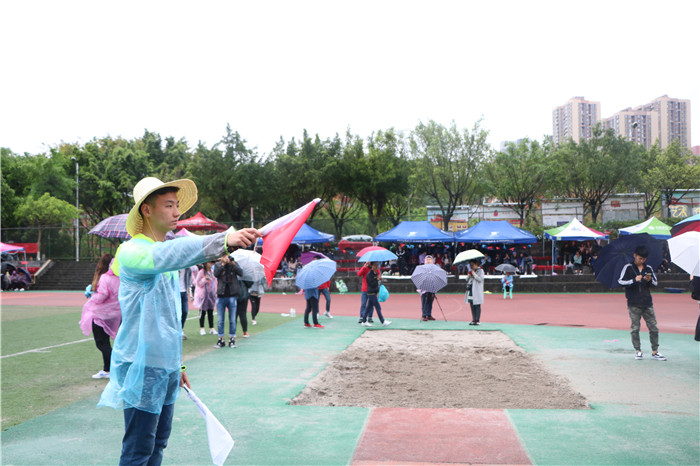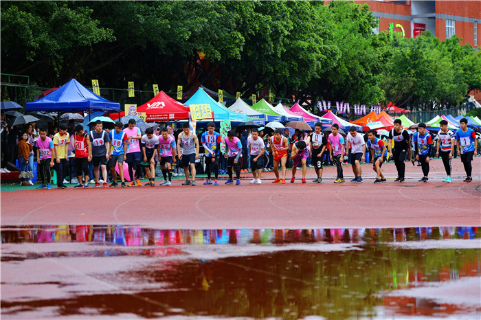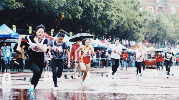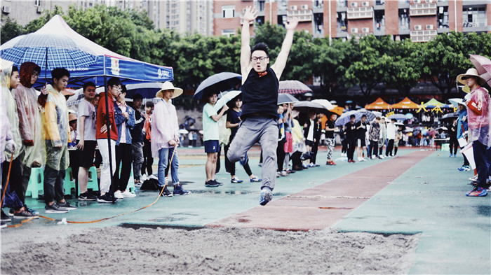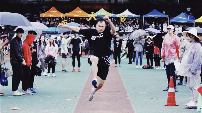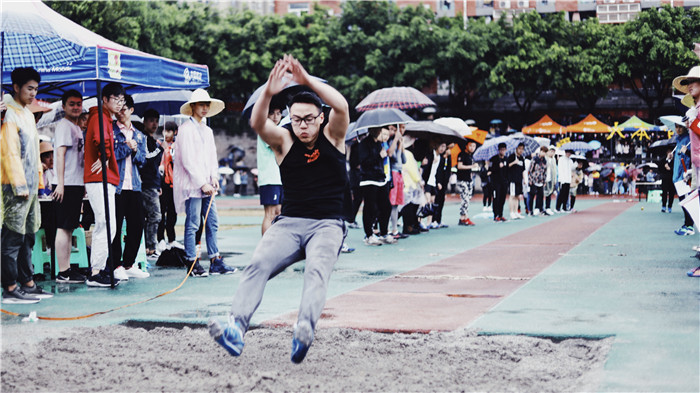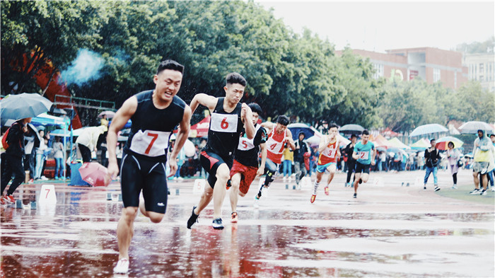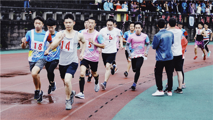 虽然天公不作美,但在红色的圆形跑道上,飞跃的身影,矫健的身姿,轻捷地掠过眼前。接力赛上,为了各自院系的荣誉你追我赶,直到交接棒稳稳的交到队友手上才能放心。周围看台上的观众们为跑道上的运动员呐喊助威,一圈又一圈,脚步不停,加油声不止。