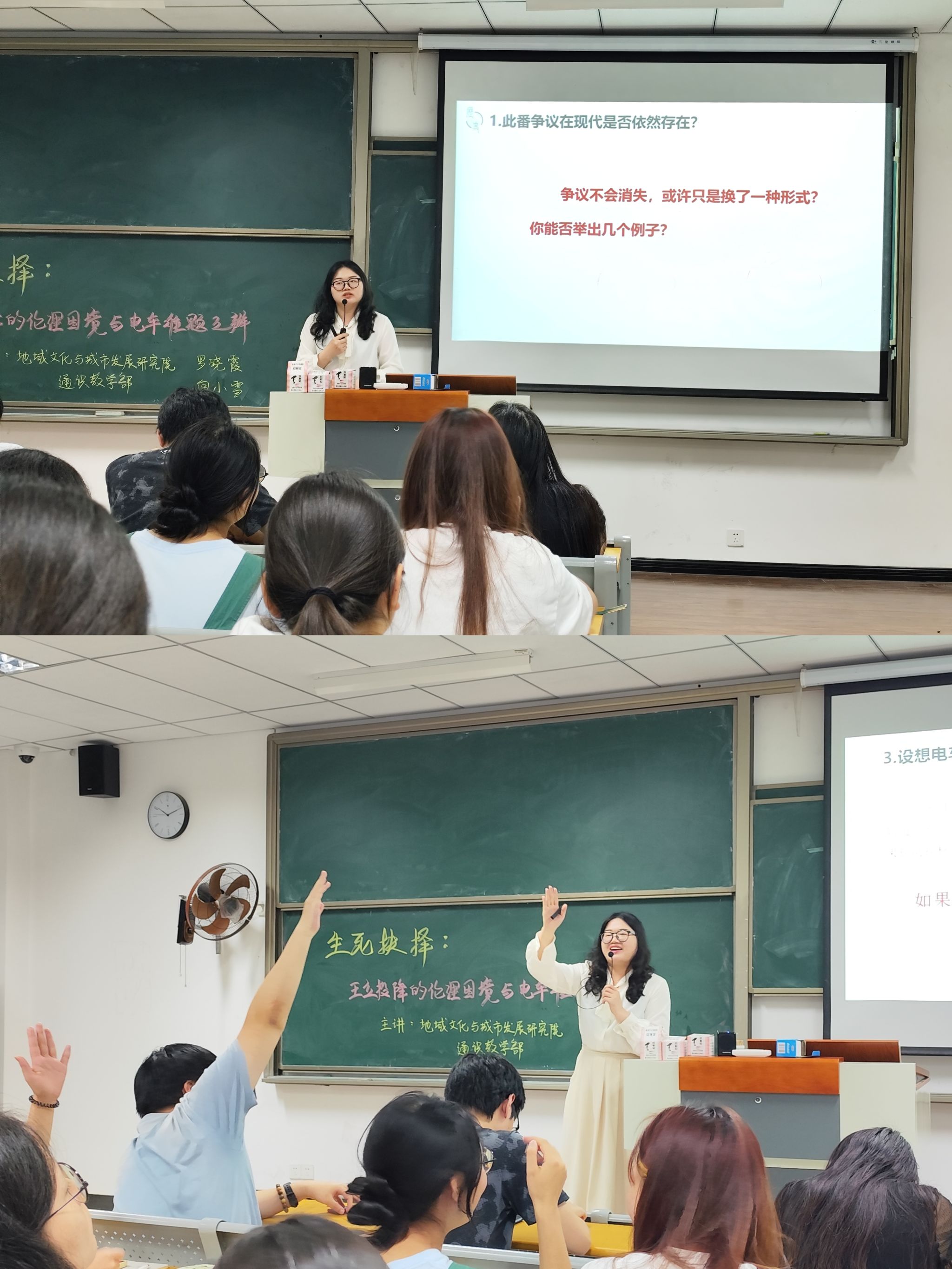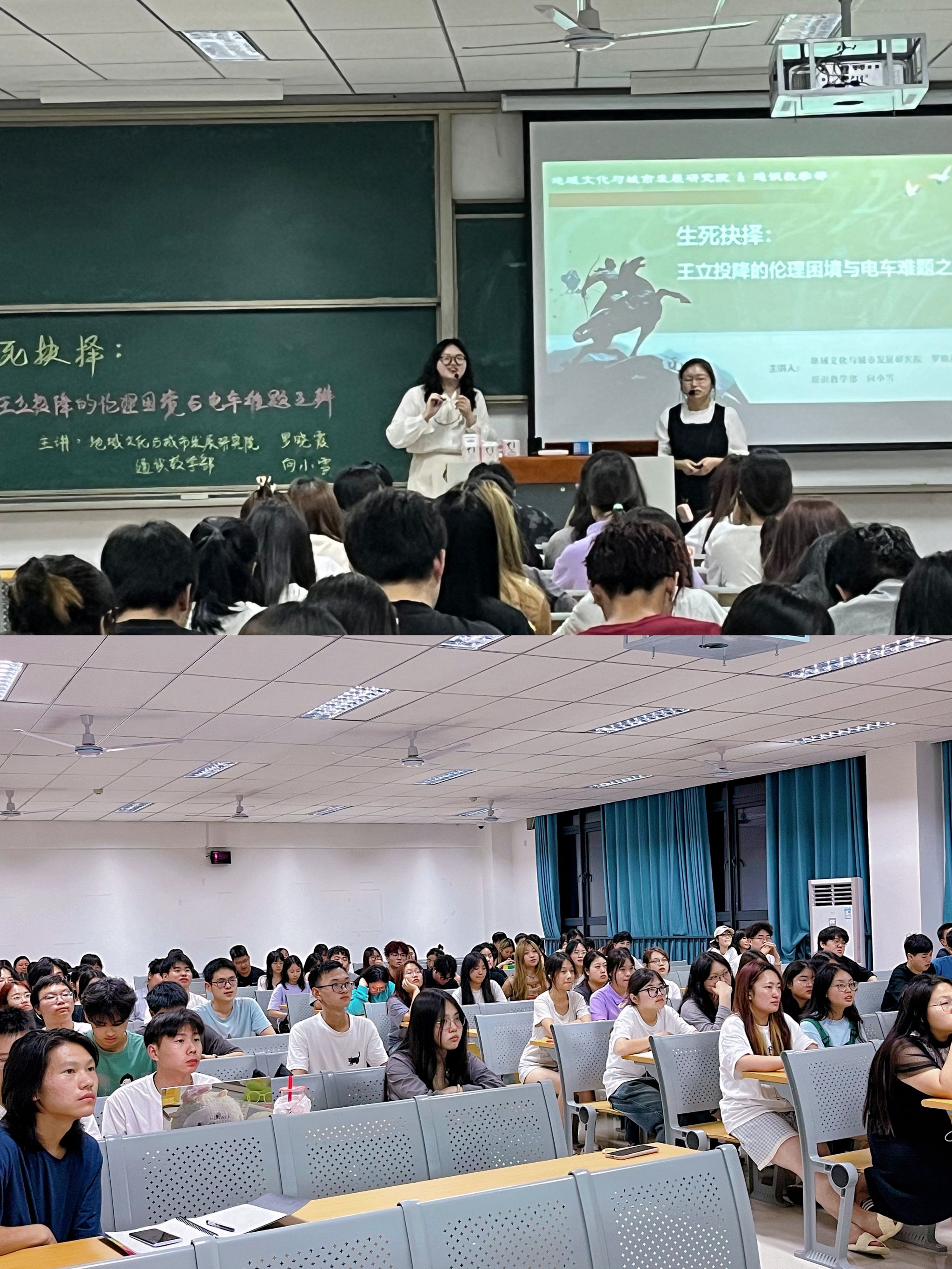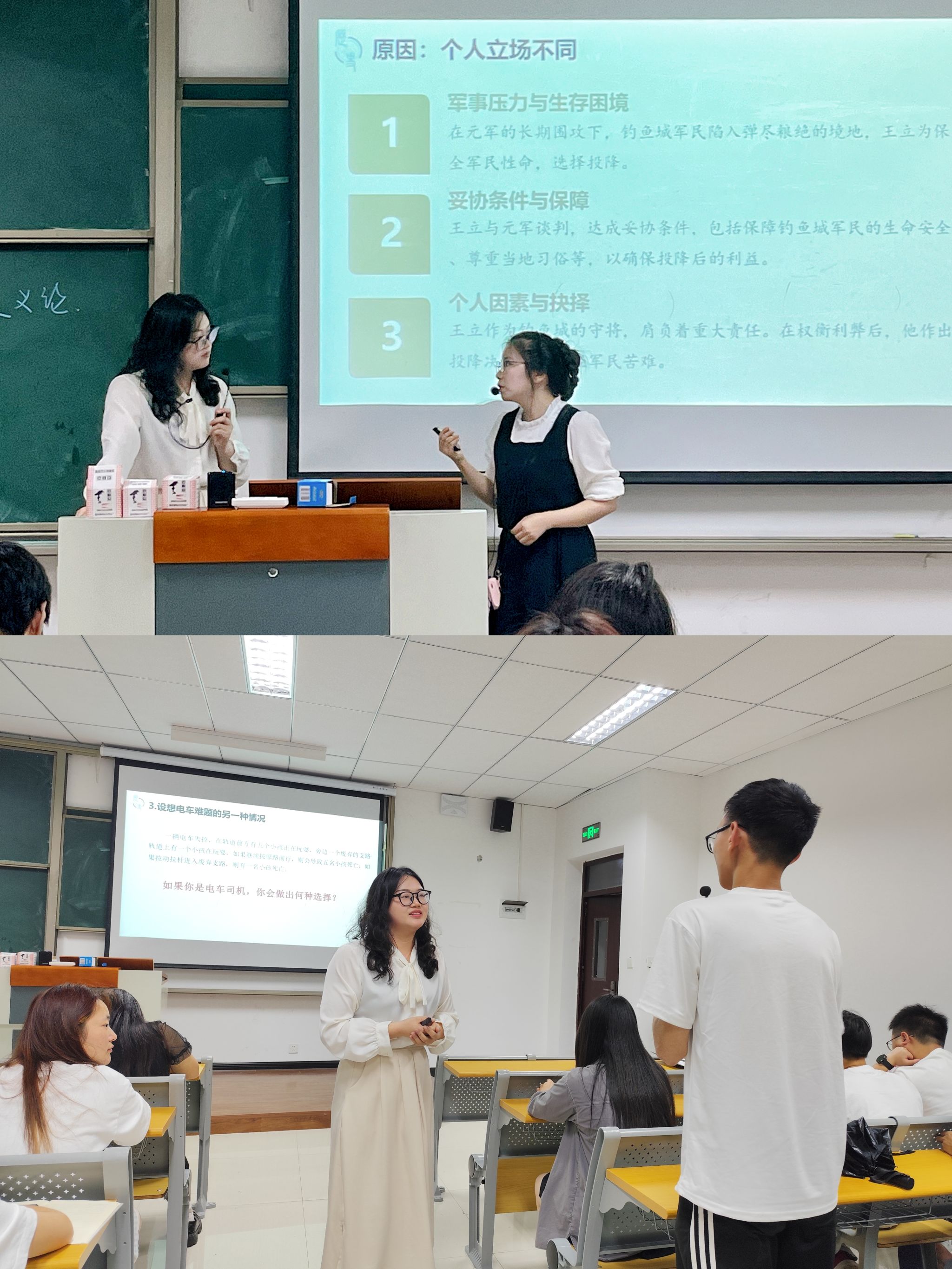 为促进学科融合,锻炼学生的创造力和批判性思维,更激发他们对历史事件和人物的深刻洞察与反思。5月28日,在9210教室,地域文化与城市发展研究院讲授《钓鱼城与世界中古历史》的罗晓霞老师与通识教学部讲授《信息技术与社会》的向小雪老师携手开展了一场生动的双师授课。本次课程的主题为“生死抉择:王立投降的伦理困境与电车难题之辩”,旨在通过对比历史与现实中的伦理难题,引导学生们深入思考个体选择与社会伦理之间的复杂关系。
