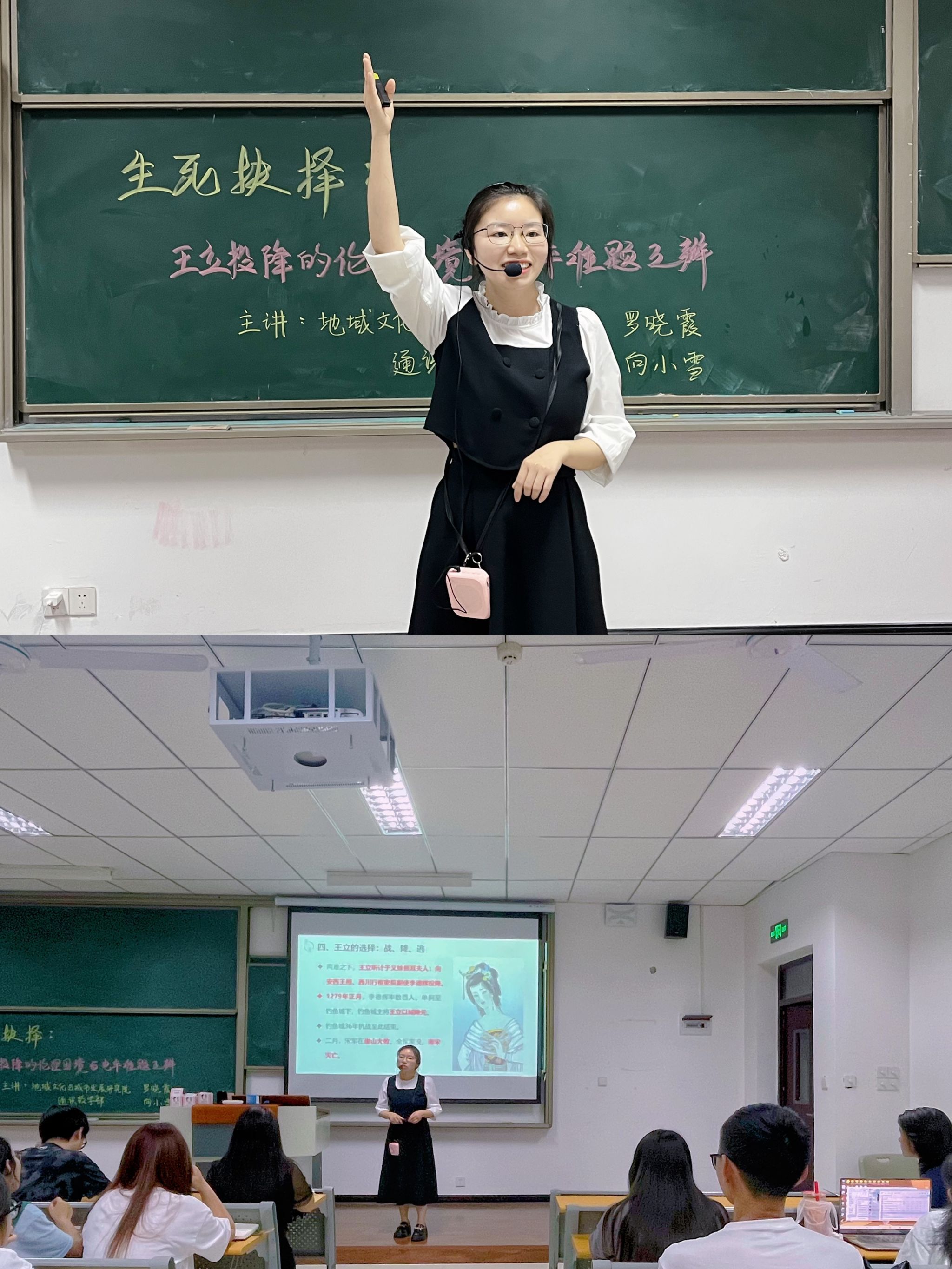 课堂上,罗晓霞老师首先带领学生们回溯了钓鱼城之战的波澜壮阔。她详细讲述了王立在面对投降与否的伦理困境时,所经历的内心挣扎与外在压力。同时,对比了安史之乱时期的睢阳保卫战,罗老师介绍道王立和张巡在相似情境下作出的截然不同选择,却都引发了后世对其行为的极端评价。