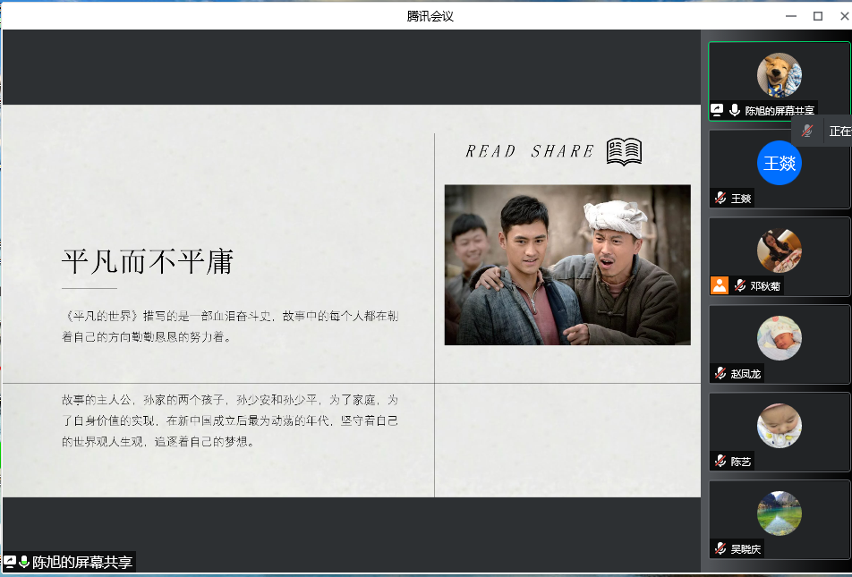 随着精美的PPT和轻柔的背景音乐,陈老师将大家带入进了“平凡的世界”中。“平凡而不平庸”,这是这本书中所刻画出的一种精神,书中的每个人物虽然奋斗艰辛,但是每个人都在朝着自己的方向勤勤恳恳地努力着前进。