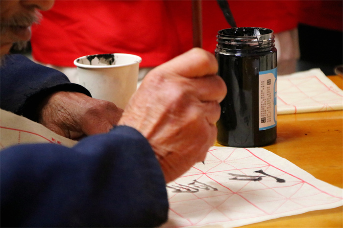 “万事顺意”将祥和喜庆的节日气氛跃然纸上,这是东津沱夕阳红敬老院的一位爷爷对所有人和对未来的祝愿,爷爷颤颤巍巍地拿起墨笔,但下笔写字时苍劲有力,面色从容,爷爷教导志愿者们要学习书画,体会传统韵味,感悟先人情思。