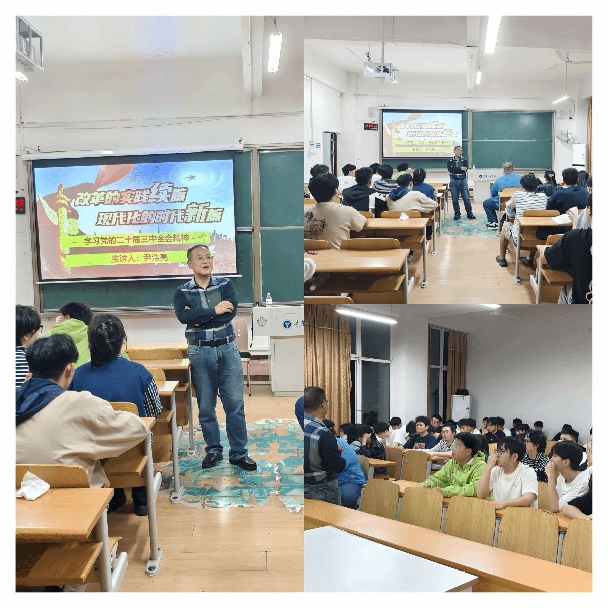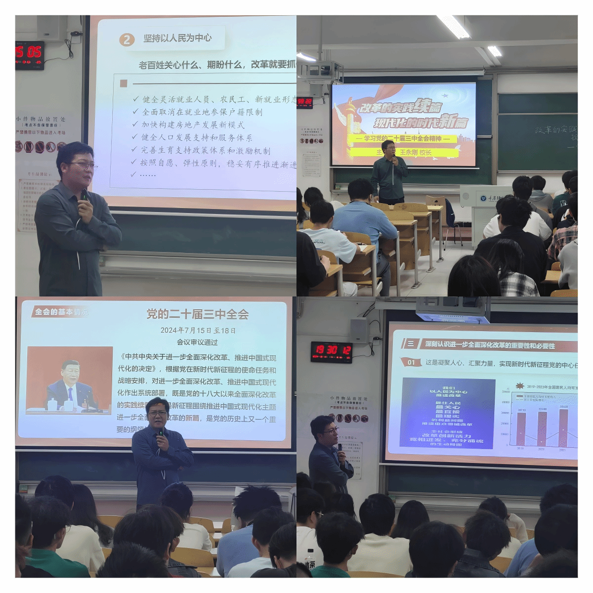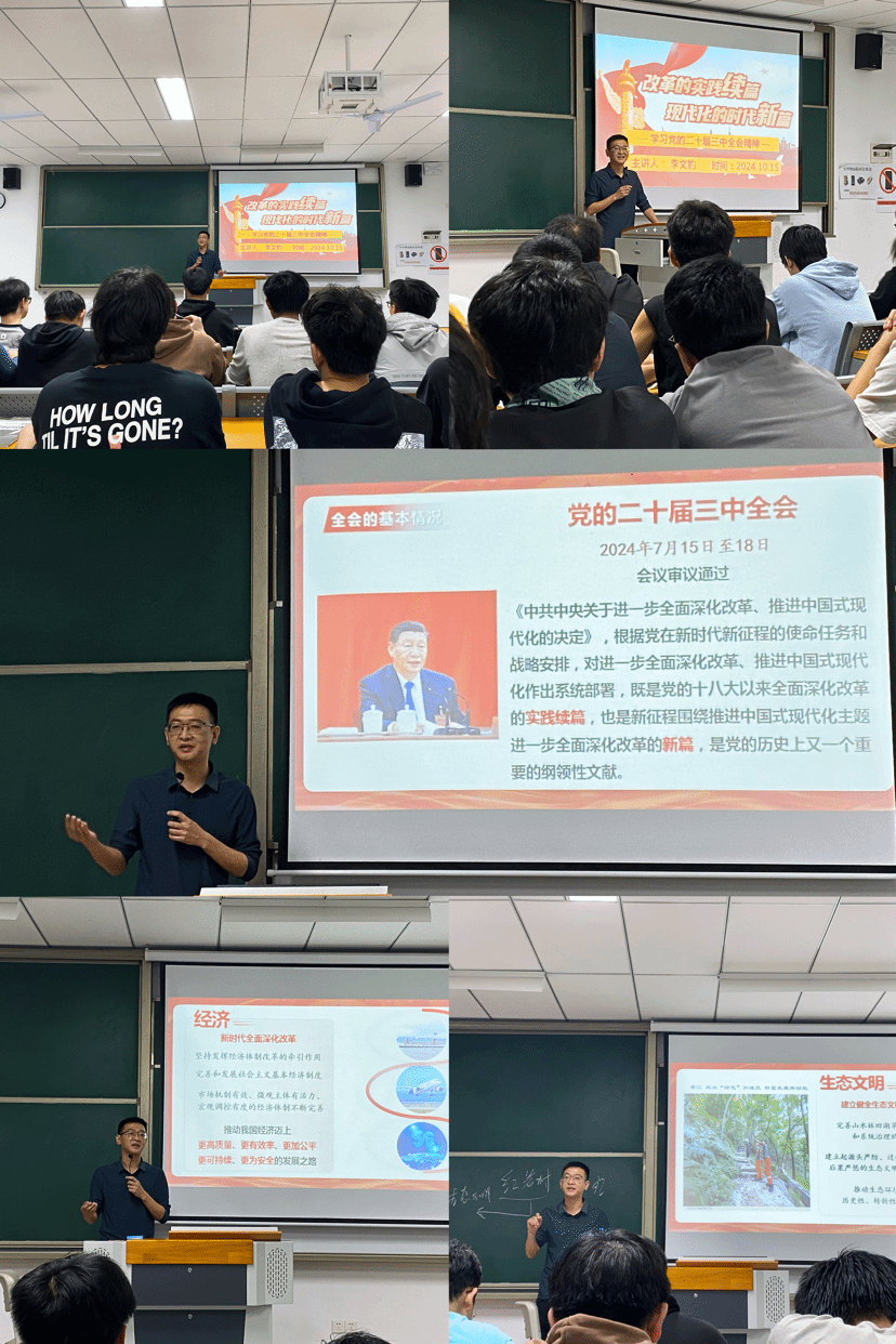 10月15日,副校长李文豹为我校2023级软件工程专升本的同学们带来了一堂激荡心灵的思政课。李文豹副校长深入讲解了习近平总书记在二十届三中全会上的重要讲话精神,对《决定》提出的进一步全面深化改革重大举措进行了全面、准确、细致的解读,每一项举措都如同拼图的碎片,在他的讲解下逐渐拼凑成一幅清晰的改革蓝图,让同学们清晰地认识到改革的方向与重点。李文豹副校长还巧妙地将全会精神与重庆实际相结合,贯通学习习近平总书记对重庆改革工作的系列重要指示要求。本班为毕业班学生,李文豹副校长鼓励即将步入社会的同学们积极参与到重庆打造全面深化改革先行区的建设中,为奋力谱写中国式现代化重庆篇章贡献青春力量。
