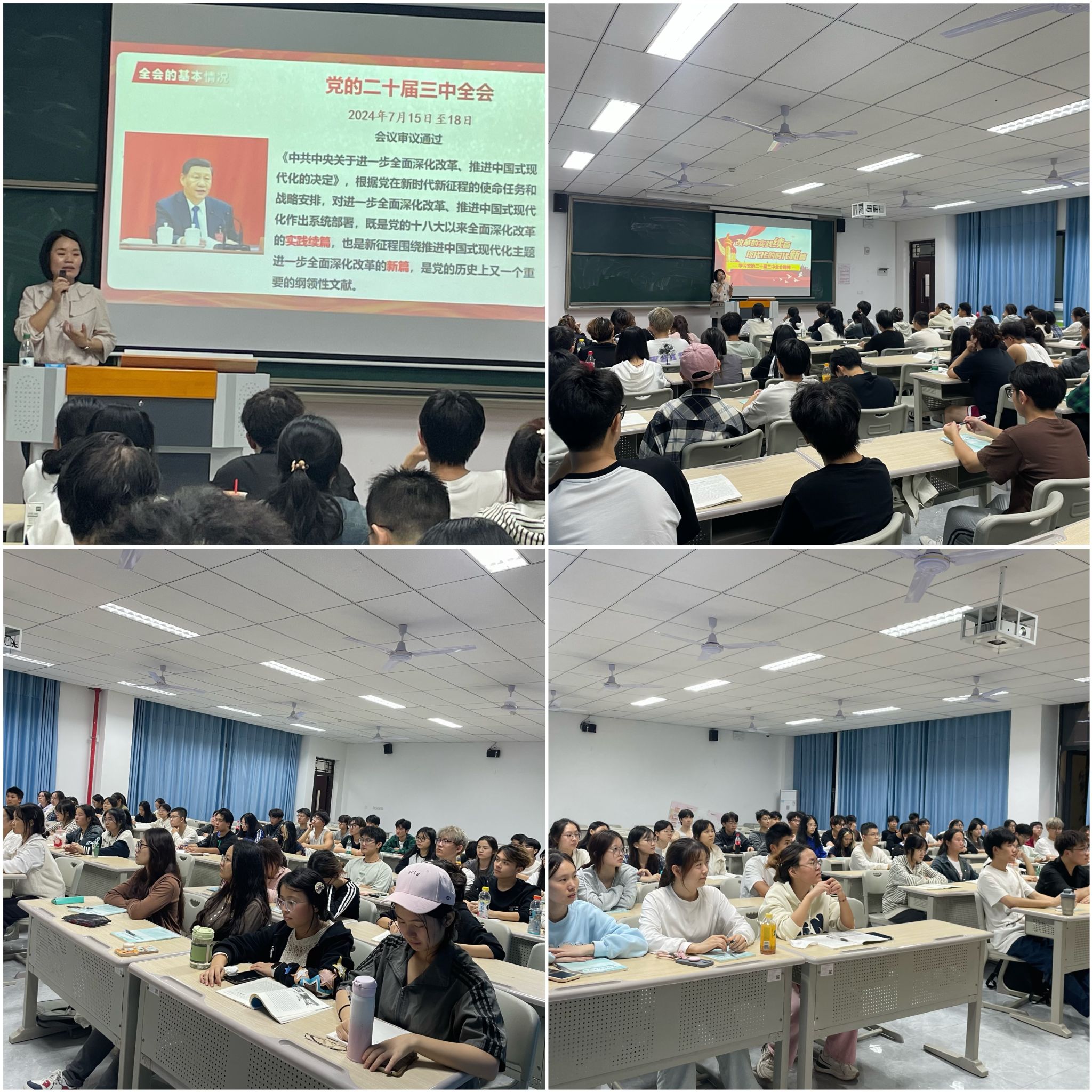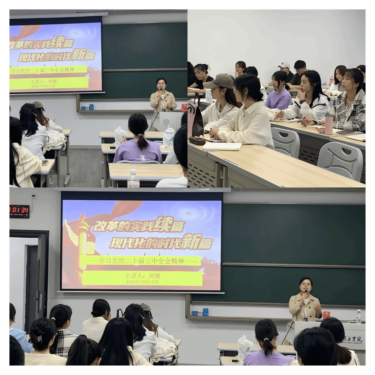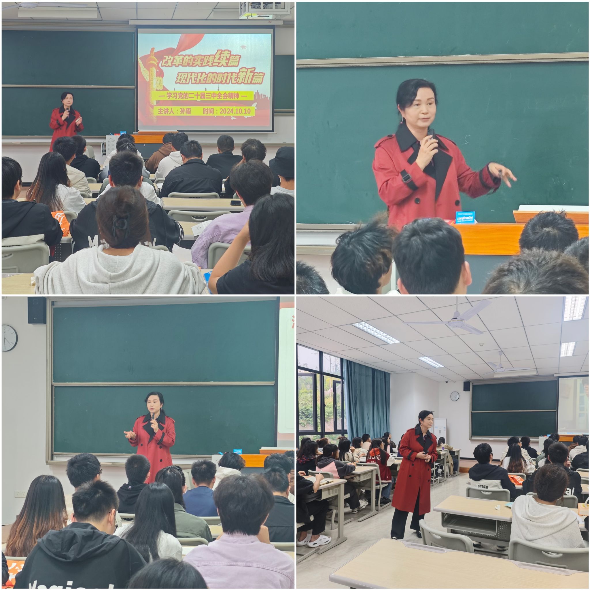 10月10日,副校长孙玺走进课堂,她以清晰的思路和生动的讲解,从多个角度对党的二十届三中全会精神进行了全面解读。孙玺副校长指出,党的二十届三中全会是在以中国式现代化全面推进强国建设、民族复兴伟业的关键时期召开的一次十分重要的会议。授课中,孙玺副校长结合学校的实际情况,强调了全会精神对学校教育教学改革的重要指导意义。她谈到,学校积极响应全会提出的深化教育综合改革的要求,不断优化教育教学模式,加强师资队伍建设,提高人才培养质量。同时,学校注重培养学生的创新精神和实践能力,使学生能够更好地适应社会发展的需求,为国家的建设和发展贡献力量。同学们要善于把握新机遇,持续奋斗,主动适应教育强国建设、区域经济社会发展对人才培养的需求,树立远大理想、练就过硬本领,为国家经济社会发展贡献智慧和力量。