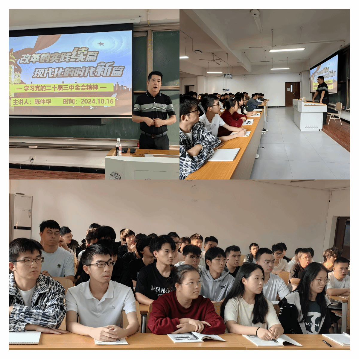 10月16日,副校长陈仲华为机械制造及其自动化专升本毕业班同学上了一堂内涵深刻、精彩生动的思政课。陈仲华副校长首先向同学们介绍了党的二十届三中全会召开的背景。接着,带领同学们深入学习了习近平总书记在党的二十届三中全会上的重要讲话精神。他强调,习近平总书记的讲话为我们进一步推进改革提供了强大的思想武器和行动指南,同学们要认真学习领会讲话精神,切实把思想和行动统一到讲话精神上来,不断增强推进改革的自觉性和坚定性。最后,他指出,全面深化改革对于青年学生意义非凡,青年是国家的未来、民族的希望,是全面深化改革的生力军和突击队。同学们要积极响应党中央的号召,投身到全面深化改革的伟大实践中去,勇于担当、敢于创新,为祖国的繁荣富强贡献自己的力量。