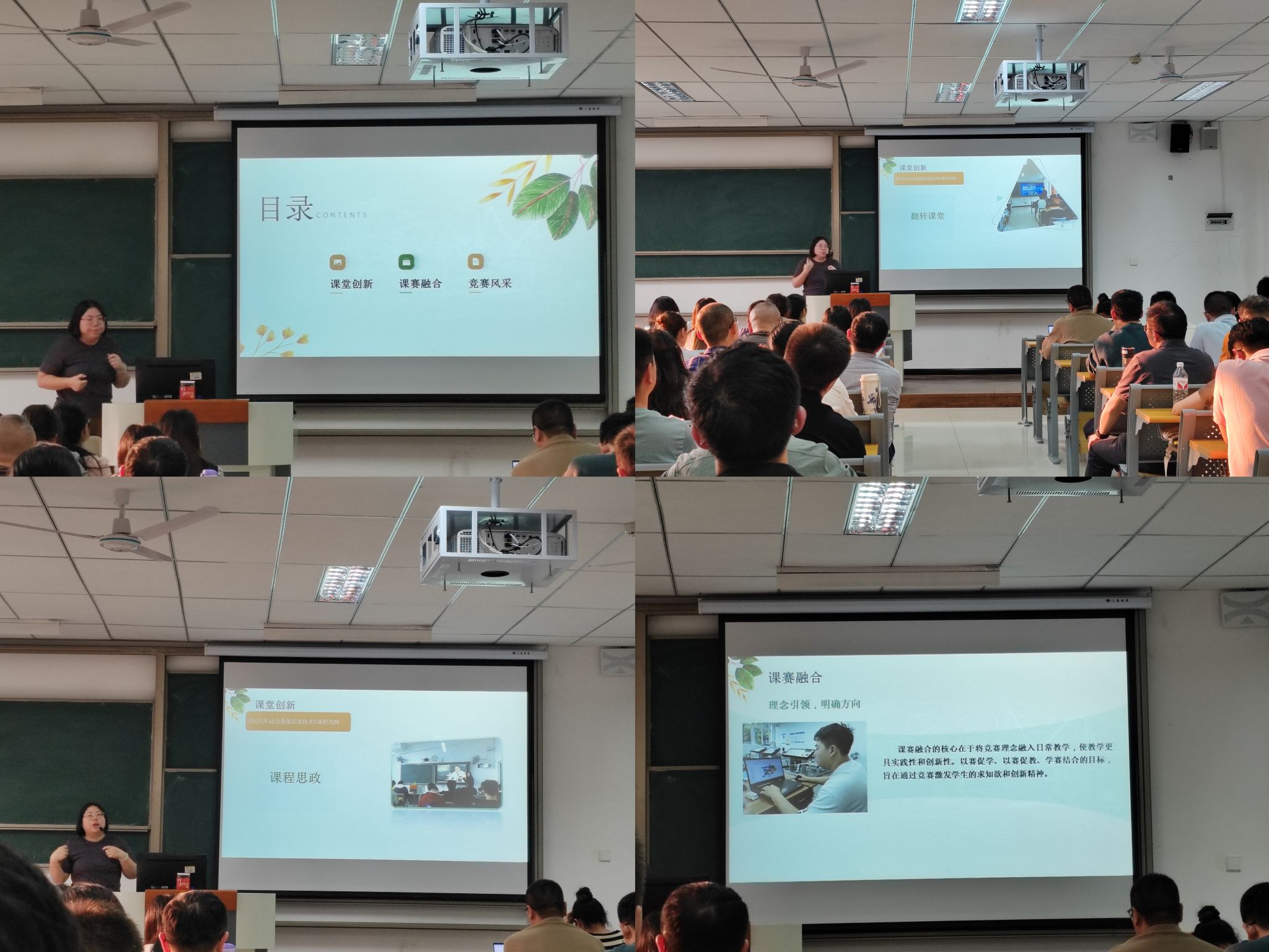 在课堂创新部分,张老师介绍了如何通过翻转课堂和课程思政的方式来激发学生的学习兴趣和创造力。她进一步分享了如何将“课程思政”与专业课有机结合,通过在教学中融入德育元素,培养学生的社会责任感和综合素质,推动了教学的全方位提升。在课赛融合方面,张老师结合自己的实践经验,提出了“理念引领,明确方向;课程优化,融入竞赛元素”的策略,在教学中融入学科竞赛的元素,不仅可以提升学生的实践能力,还能够培养他们的创新意识和团队协作精神。还分享到通过课程设计,将竞赛内容作为延伸和拓展,使学生在学习知识的同时,也能够掌握竞赛所需的技能与方法。在竞赛风采分享环节中,张老师也展示了她和学生们在各类学科竞赛中的精彩历程。她详细讲述了学生们从初次参赛时的紧张与迷茫,到通过不断努力取得优异成绩的成长历程。这些宝贵的竞赛经验不仅提高了学生的专业水平,也让他们更加自信、更加具备团队协作能力。张老师的分享鼓励了在场教师们思考如何在教学中更好地引导学生参与学科竞赛,课赛融合,推动教育教学改革。