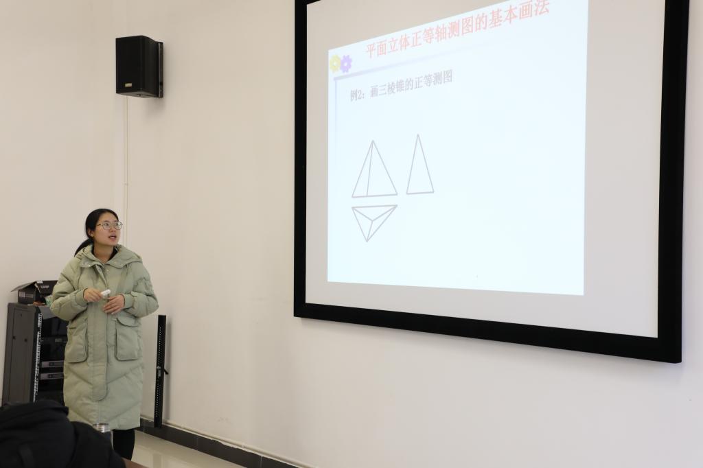冯淼老师以《机械制图》课程中“轴测图”—正等轴测图的基本画法为题,以一个鲜红的沙发照片引出正等轴测图绘制的必要性,讲解坐标法、切割法、叠加法三种方法,并对正等轴测图的基本画法与步骤进行详细的阐述和演示。冯淼老师采用启发式教学,讲练相结合,课件动画精美,氛围轻松活跃,气氛融洽。
