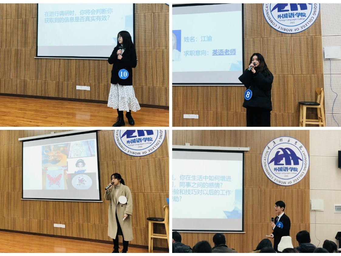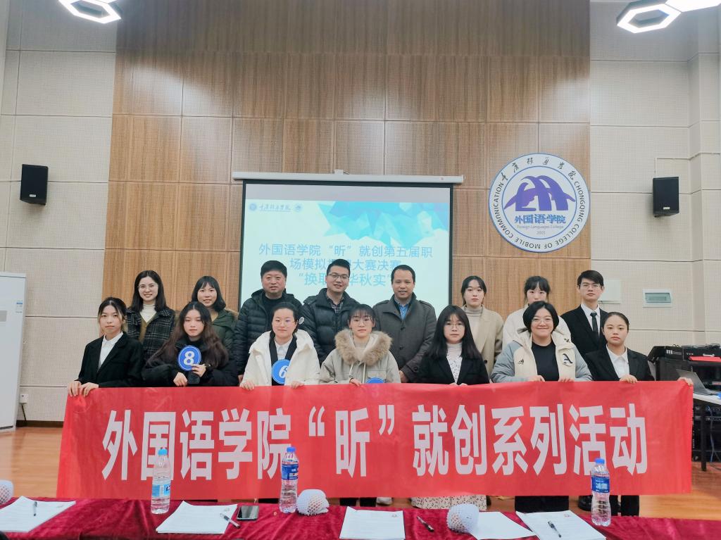 为引导当代大学生就业观念的改变,培养学生的就业技能,活跃校园就业、创业氛围,使同学们更好地认识自我、了解职场招聘、熟悉职场招聘流程、提升就业竞争能力,外国语学院就业助理团特此举办了外国语学院“昕”就创第五届职场模拟招聘大赛之换取春华秋实。经过初、复赛的层层筛选,十位参赛者最终进入决赛。2021年12月10日,在十位选手的激烈角逐下,第五届职场模拟招聘大赛决赛在天渠报告厅最终落下帷幕。