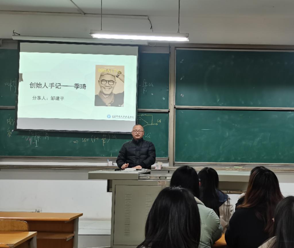 活动伊始,邹建平老师以《创始人手记——季琦》一书的所思所感进行分享。在此次分享中,邹建平老师首先分享了季琦提到的“生活即是艺术”,季琦认为每个人都是艺术家,每个人的生活都是艺术品,我们要将自己的人生当成一件最独特、最重要、最昂贵、最优美的作品来创作。邹老师关于季琦商业理念的分享为在座的老师和同学带来了颇多启发。