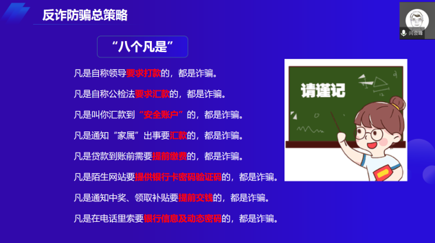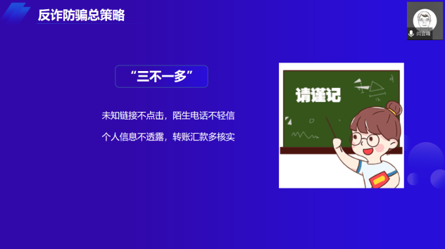 “电信诈骗不可怕,关键是要学会识别、学会防范”,闫会峰院长向大家提出“八个凡是”和“三不一多”的反诈防骗策略。凡是涉及相关内容的都属于诈骗,提醒大家一定擦亮眼睛,不点未知链接,不信陌生电话,不露个人信息,并确保每次转账前多次核实真实性。同时,闫会峰院长还指出,切记不要随便为他人提供手机卡、银行卡、网络账号的私密信息,保护好自己信息、财产安全的同时,不要有意或无意的成为他人诈骗的“帮凶”。