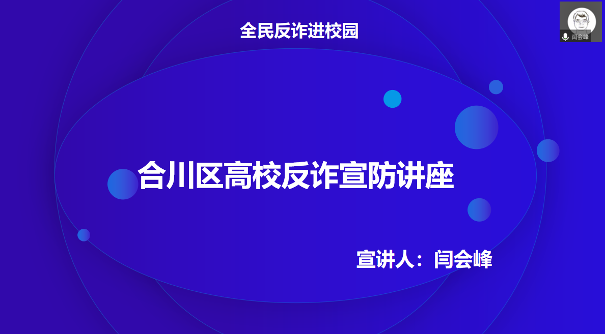 网络发展日新月异,诈骗手段层出不穷。为提高每位教职工安全防范意识,杜绝电信诈骗现象的再次发生,3月30日下午4时,大数据与计算机科学学院组织召开了“合川区高校反诈宣防讲座”。本次宣讲在线上召开,由大数据与软件学院闫会峰院长担任主讲人,合川校区与綦江校区全体教职工参加。