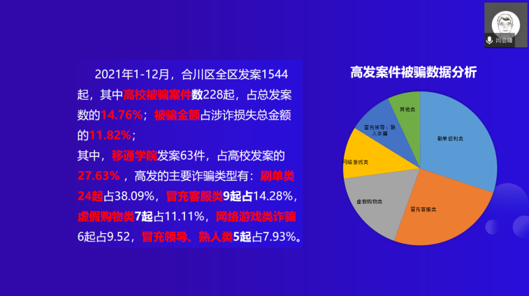 首先,闫会峰院长指出,“被骗,并不可笑”。电信诈骗案例始终存在于我们的生活中。从2021年至今,合川区共发生1544起诈骗案件,其中高校被骗案件228起,占到总案件的14.76%,移通学院被骗案件63起,占高校案件比例达27.63%。案件类型不一,诈骗手段复杂,其背后更是涉及多个团队,值得引起每一位教职工的重视。