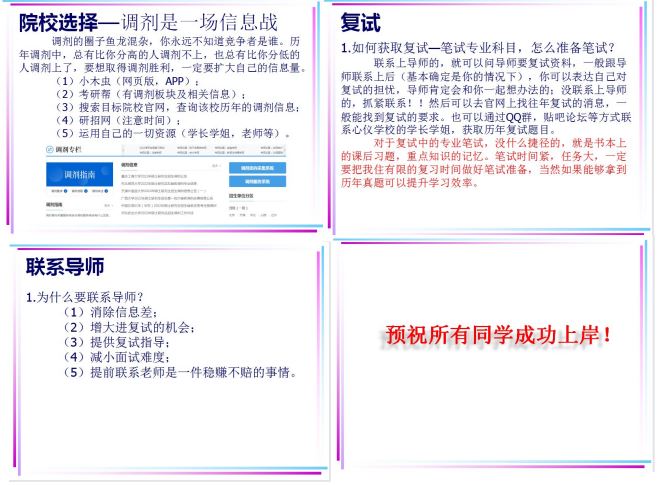 本次考研辅导讲座,干货满满,内容丰富,帮助同学们进一步认识了考研调剂的重要性,掌握了考研流程和备考方法,提升了同学们的考研信心,也希望所有同学都能在系统上看见“志愿已被招生单位查看”,收到理想学校的录取通知。