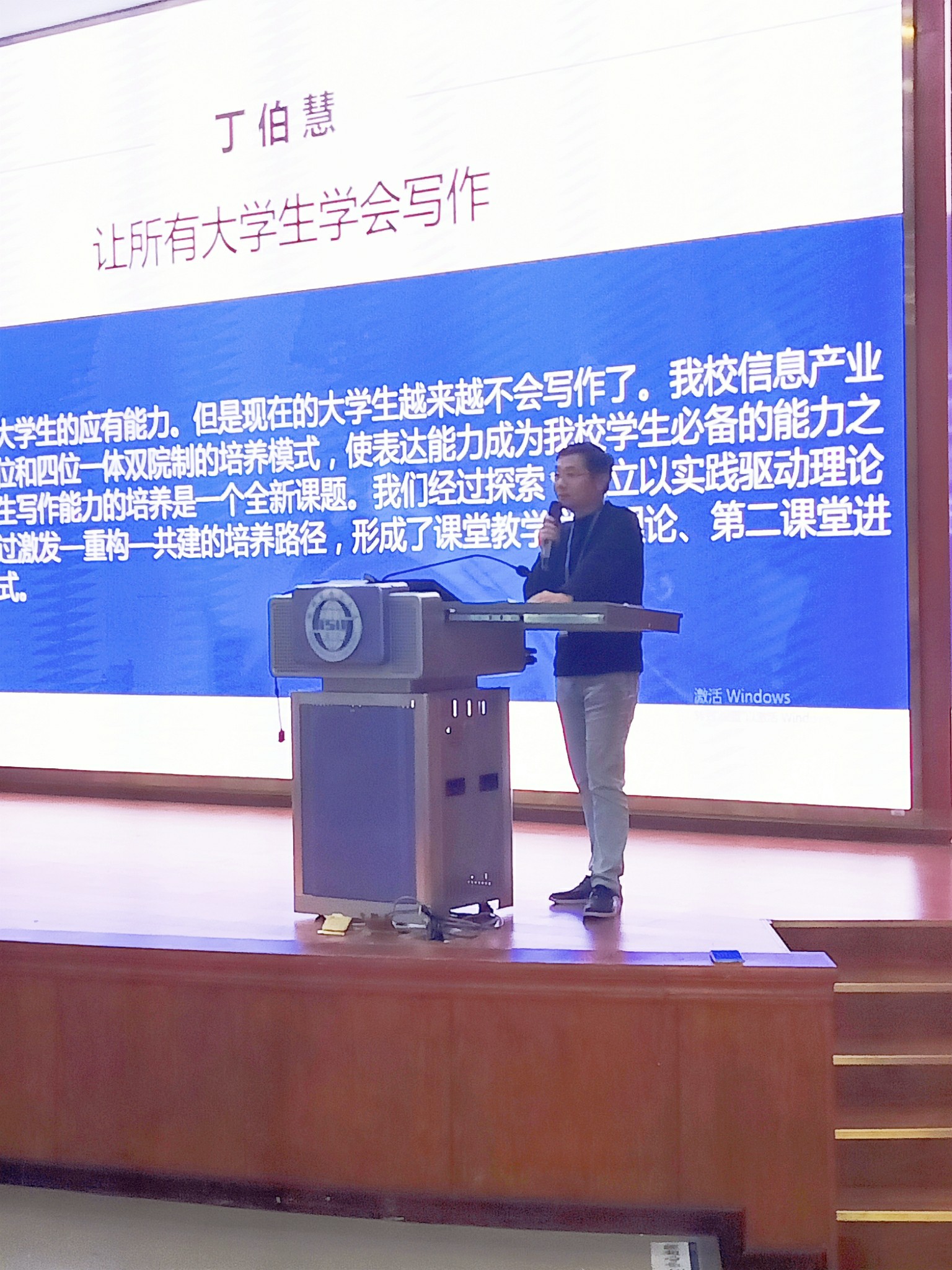 在会议主题报告环节,我校创意写作学院院长丁伯慧以《让所有大学生学会写作》为题作了发言。丁院长首先介绍了我校在创意写作教育教学实践领域所做的探索,其次分享了我校创意写作教育教学的经验。取得了热烈反响。丁院长在发言中指出,写作能力原本是大学生的应有能力,但是现在的大学生越来越不会写作了。我校信息产业商学院的办学定位和四位一体双院制的培养模式,使表达能力成为我校学生必备的能力之一。面对全校学生写作能力的培养是一个全新课题。我们经过探索,建立以实践驱动理论的培养理念,通过激发—重构—共建的培养路径,形成了课堂教学学习理论、第二课堂进行实践的培养模式。
